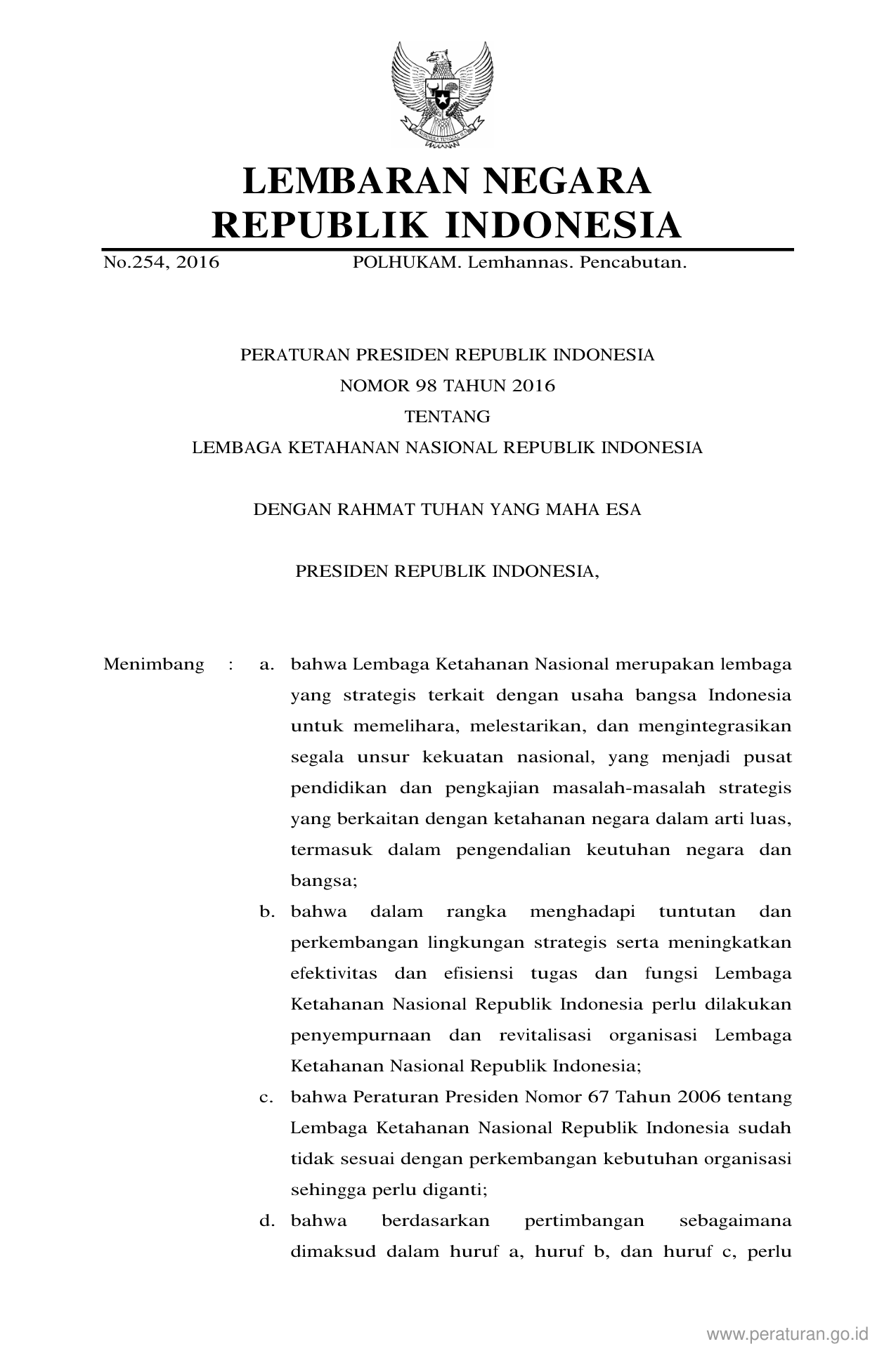 PERPRES Nomor 98 Tahun 2016 | Peraturan Presiden Nomor 98 Tahun 2016 tentang Lembaga Ketahanan Nasional Republik Indonesia