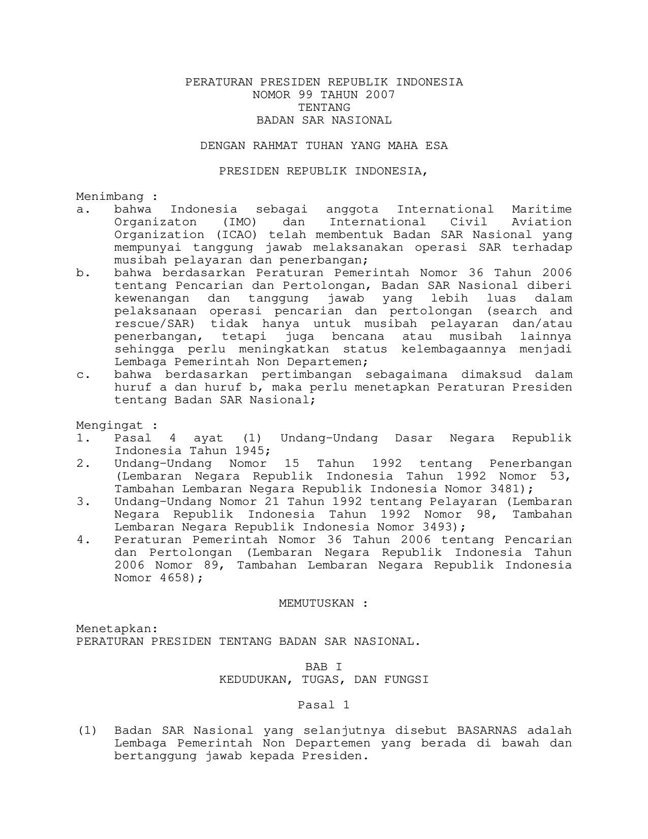 PERPRES Nomor 99 Tahun 2007 | Peraturan Presiden Nomor 99 Tahun 2007 tentang BADAN SAR NASIONAL