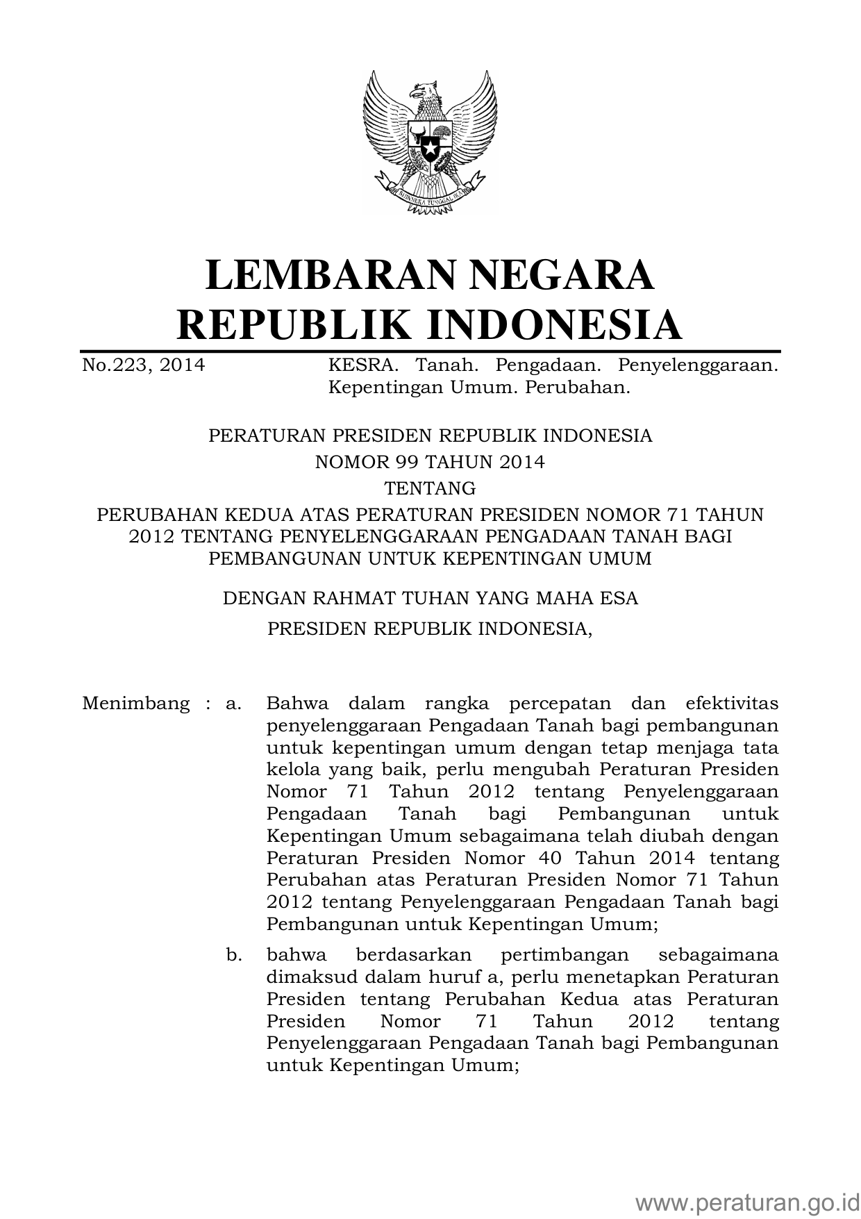 PERPRES Nomor 99 Tahun 2014 | Peraturan Presiden Nomor 99 Tahun 2014 tentang PERUBAHAN KEDUA ATAS PERATURAN PRESIDEN NOMOR 71 TAHUN 2012 TENTANG PENYELENGGARAAN PENGADAAN TANAH BAGI PEMBANGUNAN UNTUK KEPENTINGAN UMUM