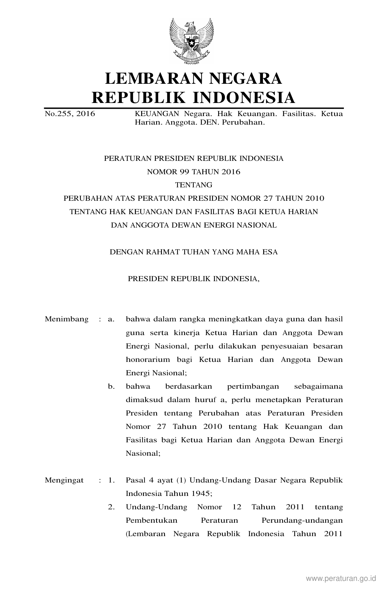 PERPRES Nomor 99 Tahun 2016 | Peraturan Presiden Nomor 99 Tahun 2016 tentang Perubahan Atas Peraturan Presiden Nomor 27 Tahun 2010 Tentang Hak Keuangan Dan Fasilitas Bagi Ketua Harian Dan Anggota Dewan Energi Nasional