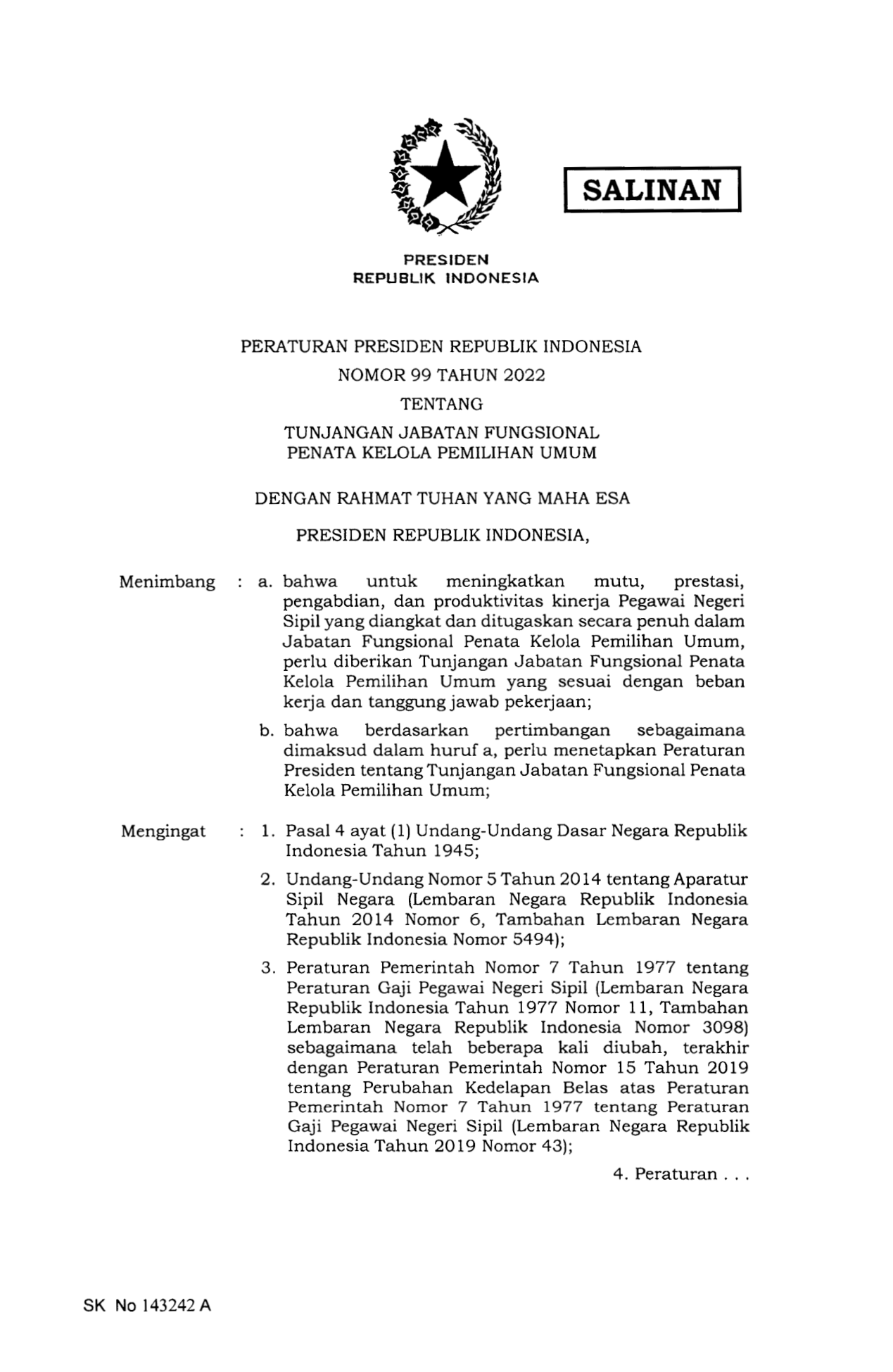PERPRES Nomor 99 Tahun 2022 | Peraturan Presiden Nomor 99 Tahun 2022 tentang Tunjangan Jabatan Fungsional Penata Kelola Pemilihan Umum