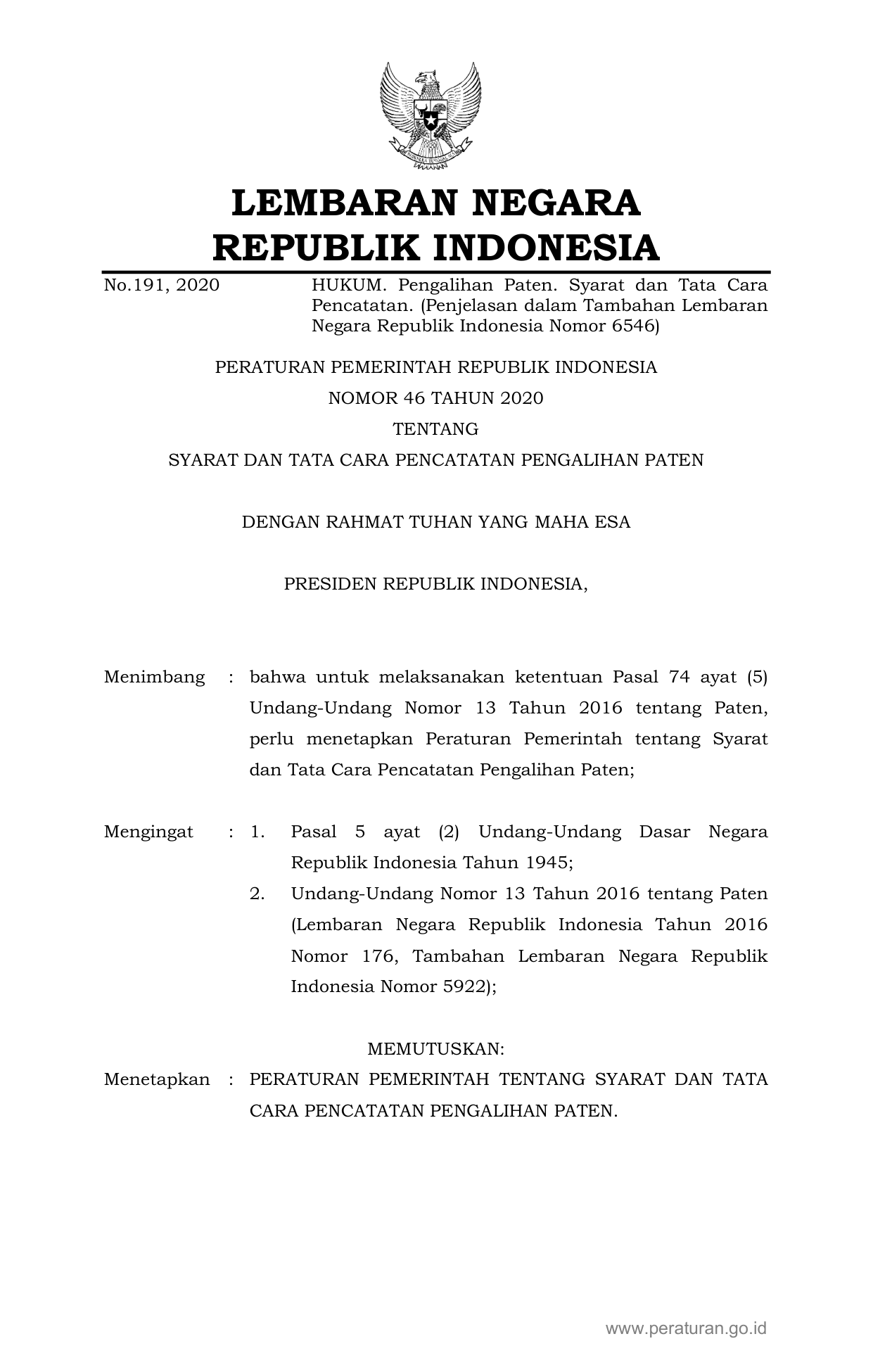PERPRES Nomor 46 Tahun 2020 | Peraturan Presiden Nomor 46 Tahun 2020 tentang SYARAT DAN TATA CARA PENCATATAN PENGALIHAN PATEN
