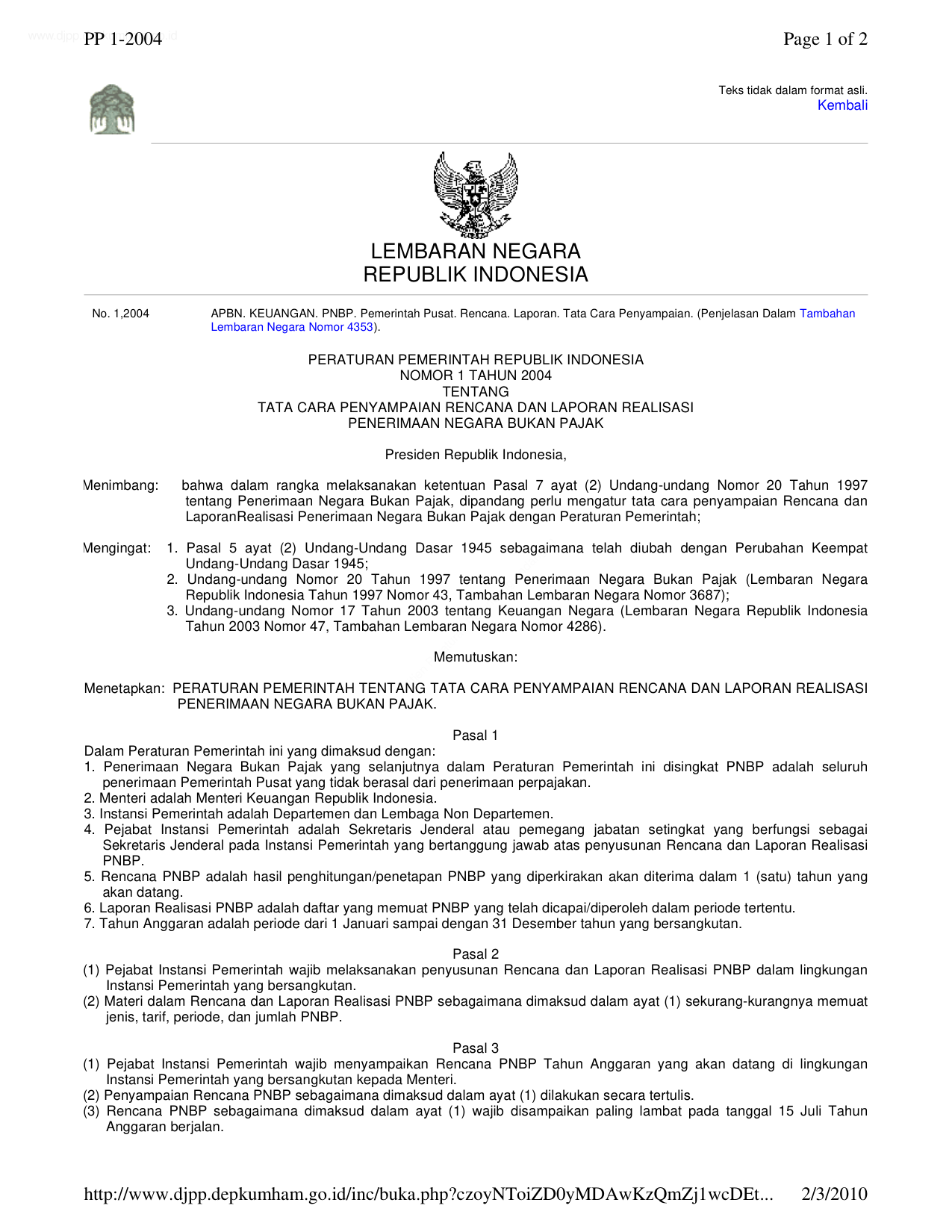 PP Nomor 1 Tahun 2004 | Peraturan Pemerintah Nomor 1 Tahun 2004 tentang TATA CARA PENYAMPAIAN RENCANA DAN LAPORAN REALISASI PENERIMAAN NEGARA BUKAN PAJAK