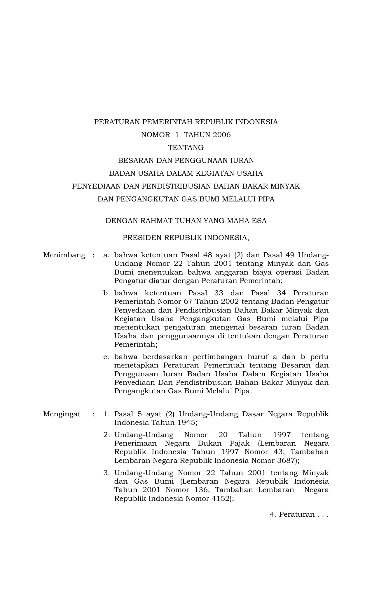 PP Nomor 1 Tahun 2006 | Peraturan Pemerintah Nomor 1 Tahun 2006 tentang BESARAN DAN PENGGUNAAN IURAN BADAN USAHA DALAM KEGIATAN USAHA PENYEDIAAN DAN PENDISTRIBUSIAN BAHAN BAKAR MINYAK DAN PENGANGKUTAN GAS BUMI MELALUI PIPA