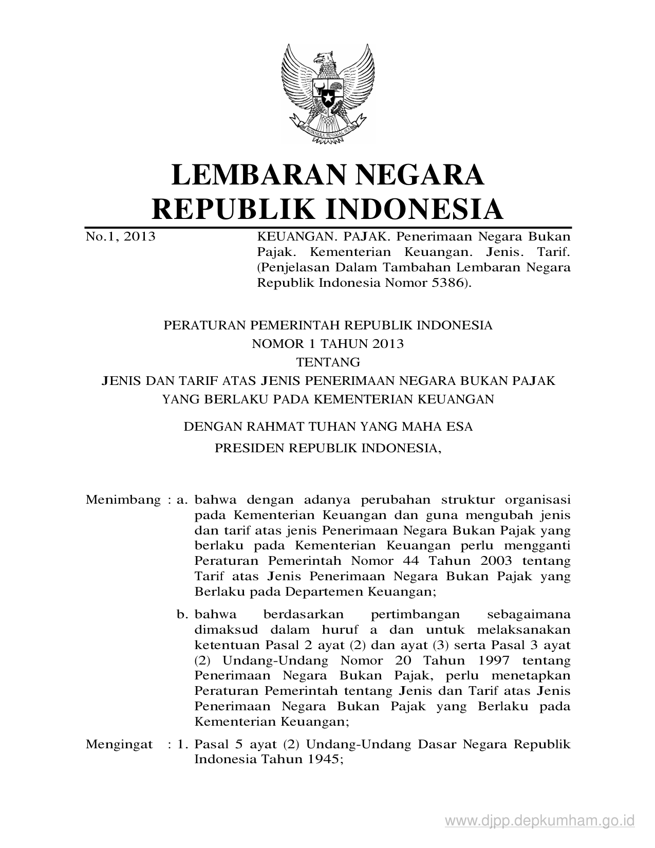 PP Nomor 1 Tahun 2013 | Peraturan Pemerintah Nomor 1 Tahun 2013 tentang JENIS DAN TARIF ATAS JENIS PENERIMAAN NEGARA BUKAN PAJAK YANG BERLAKU PADA KEMENTERIAN KEUANGAN