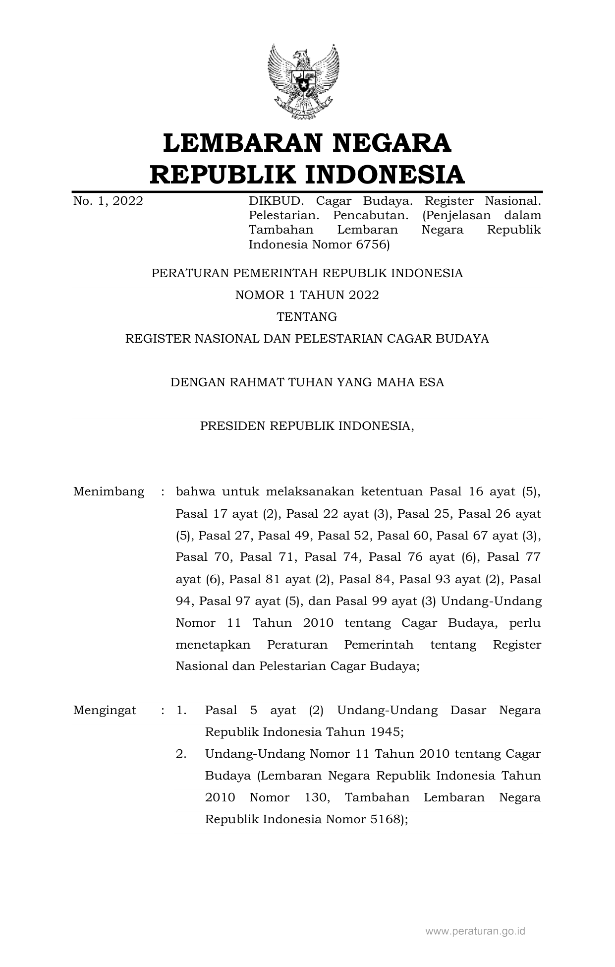 PP Nomor 1 Tahun 2022 | Peraturan Pemerintah Nomor 1 Tahun 2022 tentang REGISTER NASIONAL DAN PELESTARIAN CAGAR BUDAYA