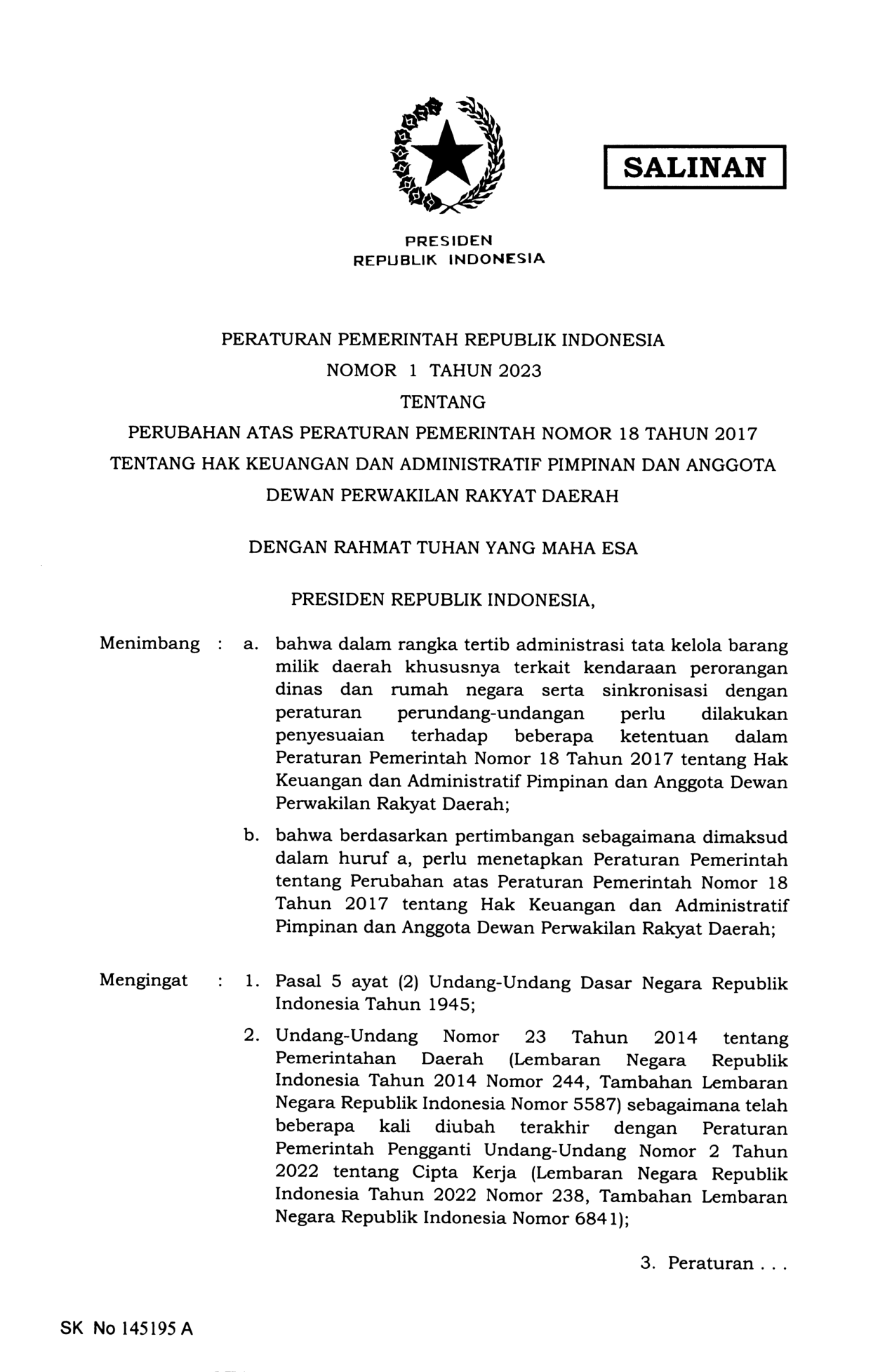 PP Nomor 1 Tahun 2023 | Peraturan Pemerintah Nomor 1 Tahun 2023 tentang PERUBAHAN ATAS PERATURAN PEMERINTAH NOMOR 18 TAHUN 2017 TENTANG HAK KEUANGAN DAN ADMINISTRATIF PIMPINAN DAN ANGGOTA DEWAN PERWAKILAN RAKYAT DAERAH