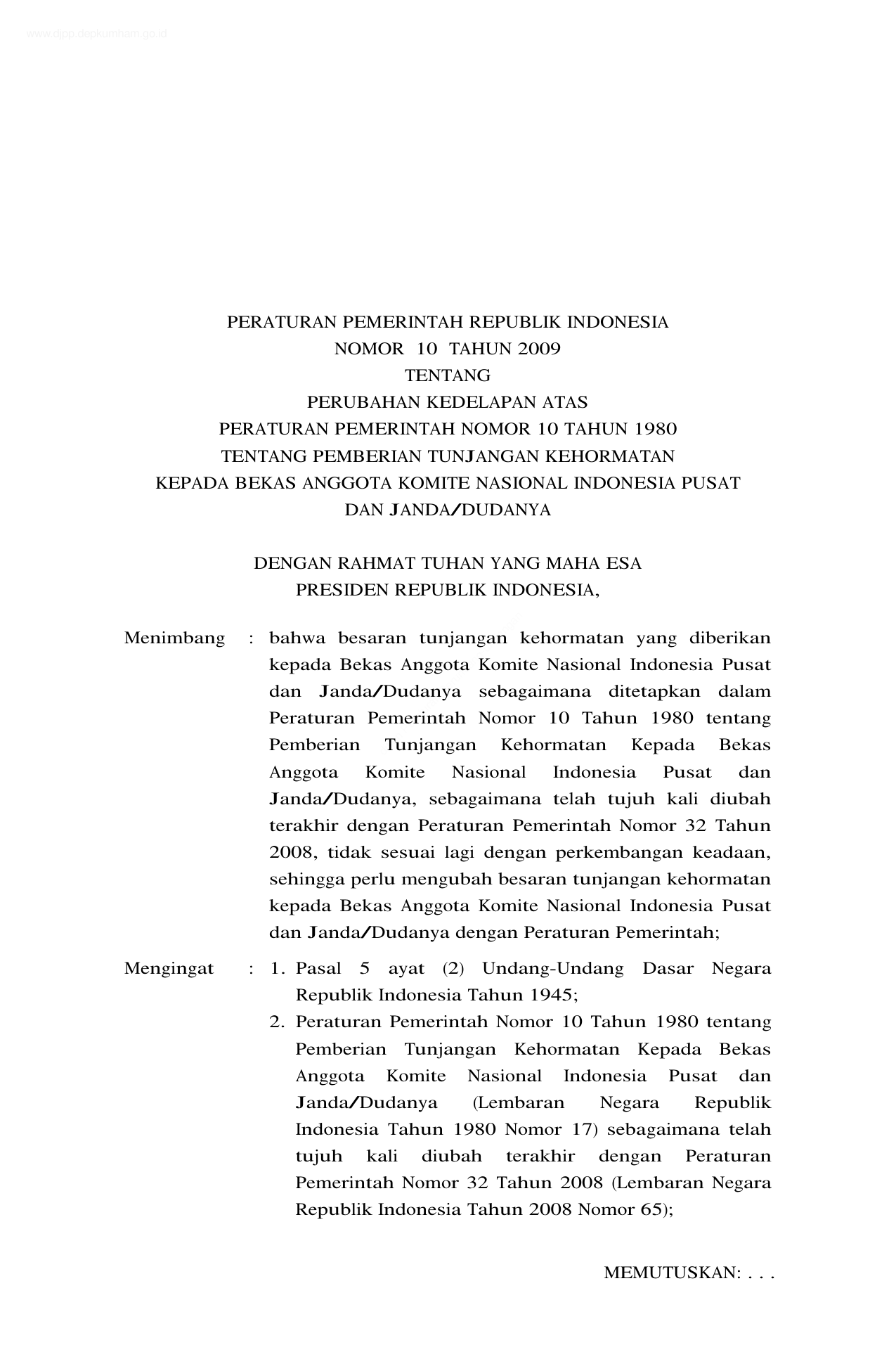 PP Nomor 10 Tahun 2009 | Peraturan Pemerintah Nomor 10 Tahun 2009 tentang PERUBAHAN KEDELAPAN PP 10-1980 TENTANG PEMBERIAN TUNJANGAN KEHORMATAN KEPADA BEKAS ANGGOTA KOMITE NASIONAL INDONESIA PUSAT DAN JANDA/DUDANYA