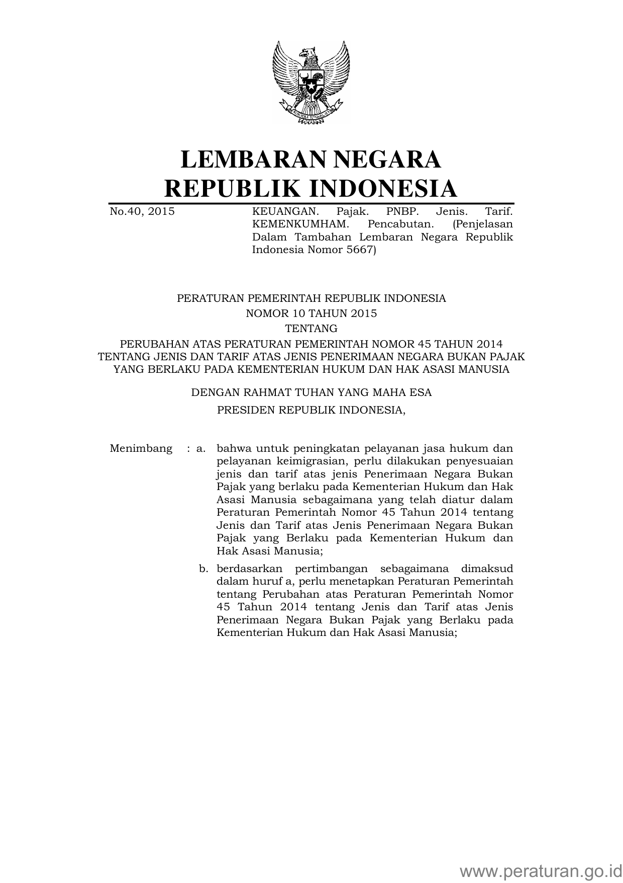 PP Nomor 10 Tahun 2015 | Peraturan Pemerintah Nomor 10 Tahun 2015 tentang PERUBAHAN ATAS PERATURAN PEMERINTAH NOMOR 45 TAHUN 2014 TENTANG JENIS DAN TARIF ATAS JENIS PENERIMAAN NEGARA BUKAN PAJAK YANG BERLAKU PADA KEMENTERIAN HUKUM DAN HAK ASASI MANUSIA