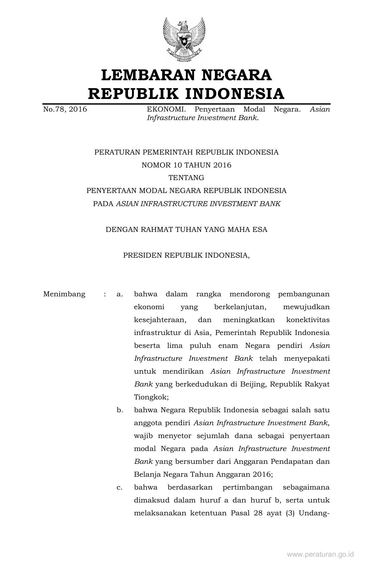PP Nomor 10 Tahun 2016 | Peraturan Pemerintah Nomor 10 Tahun 2016 tentang Penyertaan Modal Negara Republik Indonesia Pada Asian Infrastructure Investment Bank