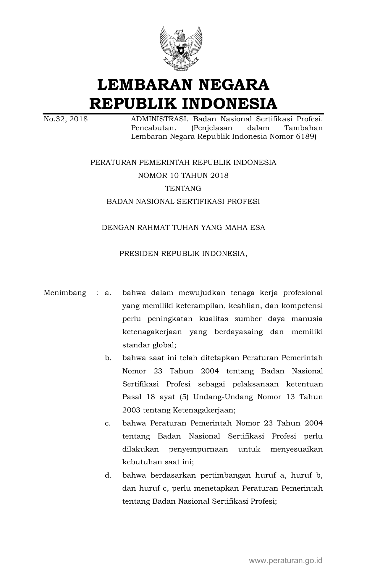 PP Nomor 10 Tahun 2018 | Peraturan Pemerintah Nomor 10 Tahun 2018 tentang Badan Nasional Sertifikasi Profesi