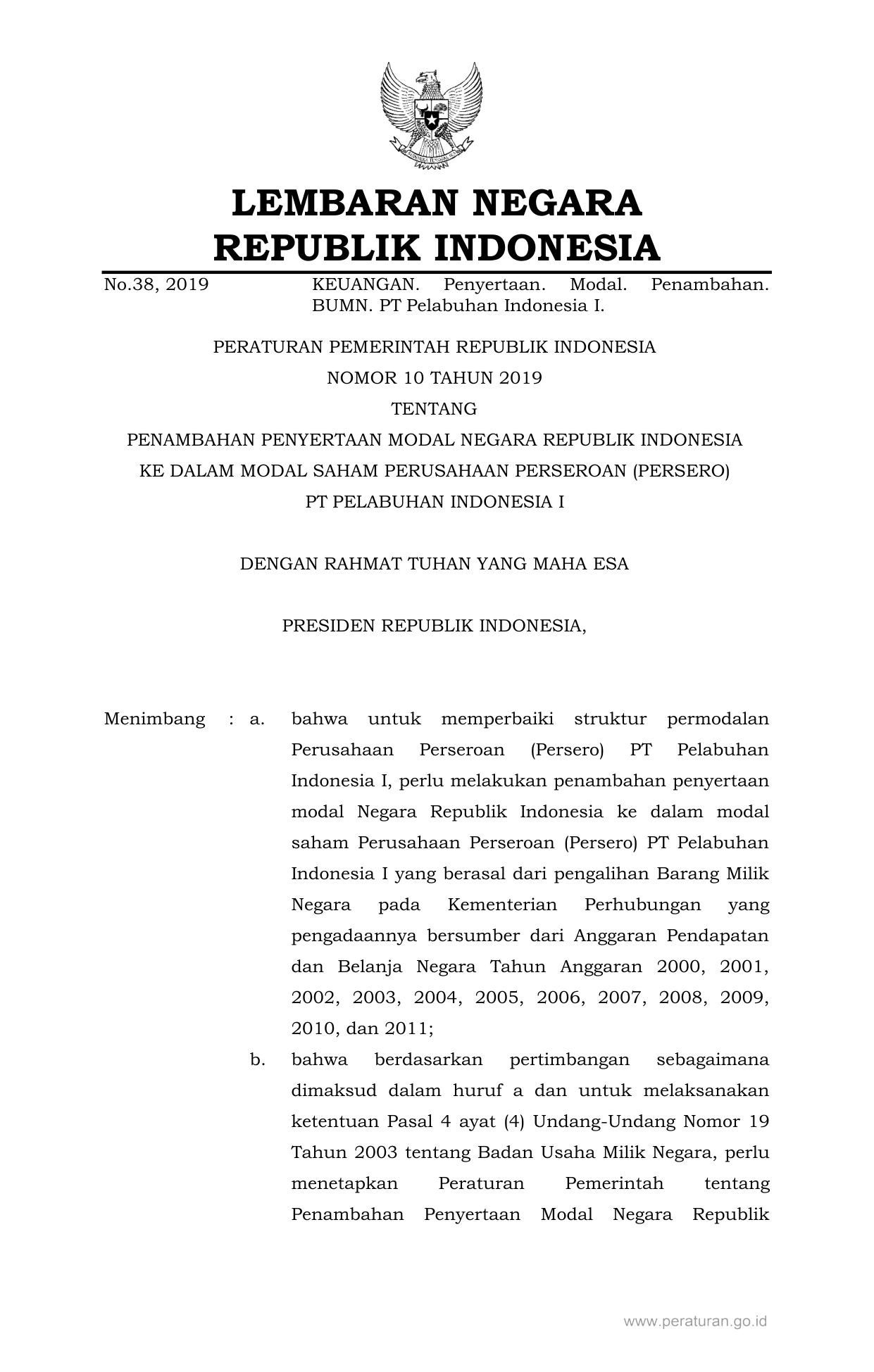PP Nomor 10 Tahun 2019 | Peraturan Pemerintah Nomor 10 Tahun 2019 tentang PENAMBAHAN PENYERTAAN MODAL NEGARA REPUBLIK INDONESIA KE DALAM MODAL SAHAM PERUSAHAAN PERSEROAN (PERSERO) PT PELABUHAN INDONESIA I