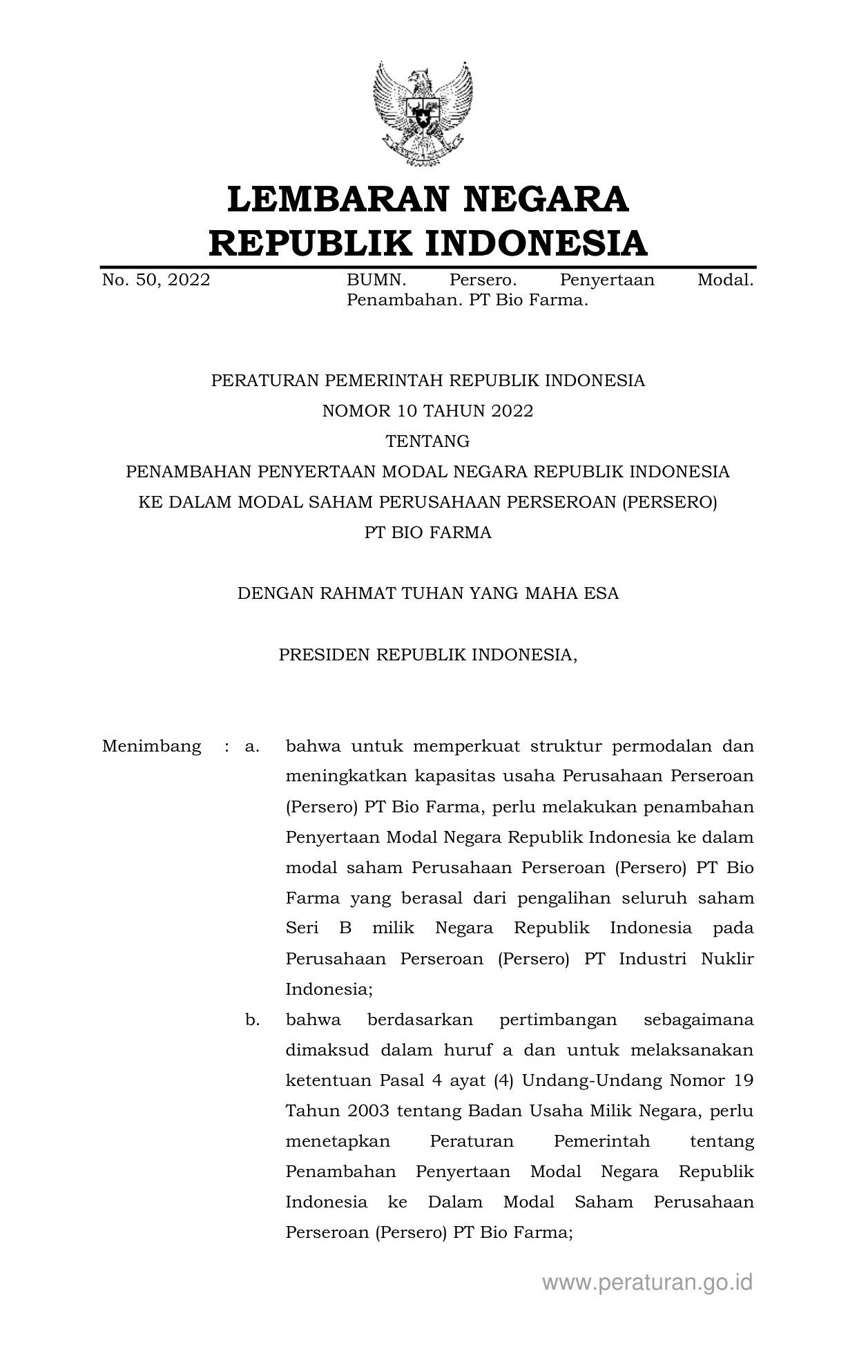 PP Nomor 10 Tahun 2022 | Peraturan Pemerintah Nomor 10 Tahun 2022 tentang PENAMBAHAN PENYERTAAN MODAL NEGARA REPUBLIK INDONESIA KE DALAM MODAL SAHAM PERUSAHAAN PERSEROAN (PERSERO) PT BIO FARMA