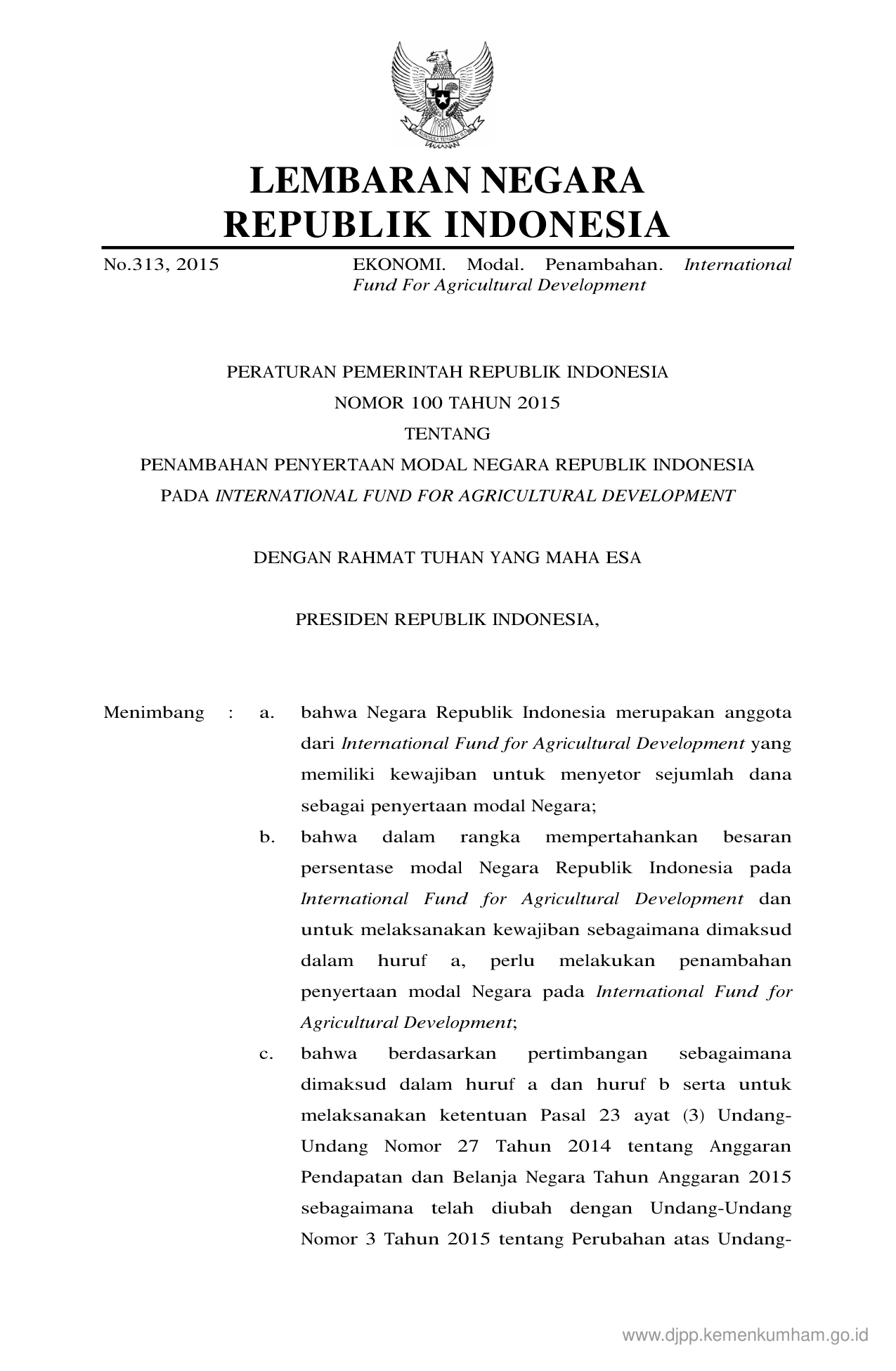 PP Nomor 100 Tahun 2015 | Peraturan Pemerintah Nomor 100 Tahun 2015 tentang PENAMBAHAN PENYERTAAN MODAL NEGARA REPUBLIK INDONESIA PADA INTERNATIONAL FUND FOR AGRICULTURAL DEVELOPMENT