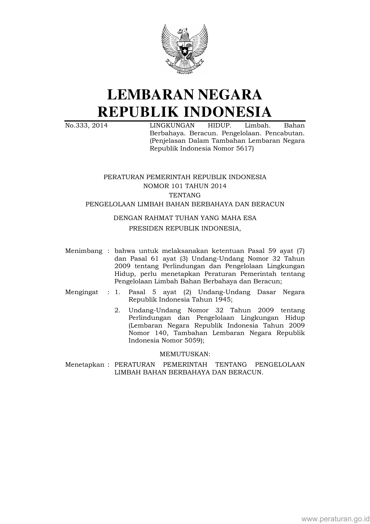 PP Nomor 101 Tahun 2014 | Peraturan Pemerintah Nomor 101 Tahun 2014 tentang PENGELOLAAN LIMBAH BAHAN BERBAHAYA DAN BERACUN