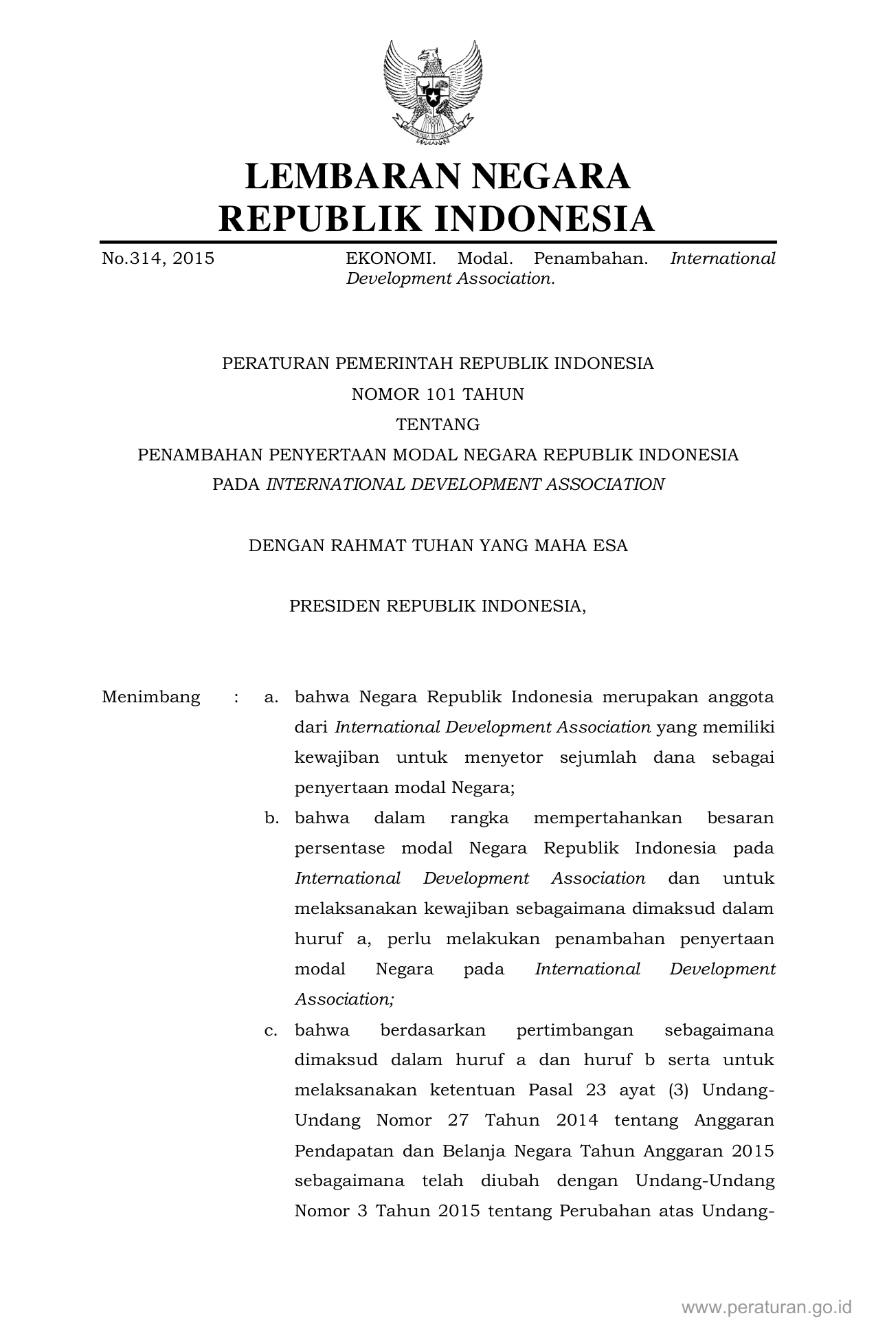 PP Nomor 101 Tahun 2015 | Peraturan Pemerintah Nomor 101 Tahun 2015 tentang PENAMBAHAN PENYERTAAN MODAL NEGARA REPUBLIK INDONESIA PADA INTERNATIONAL DEVELOPMENT ASSOCIATION