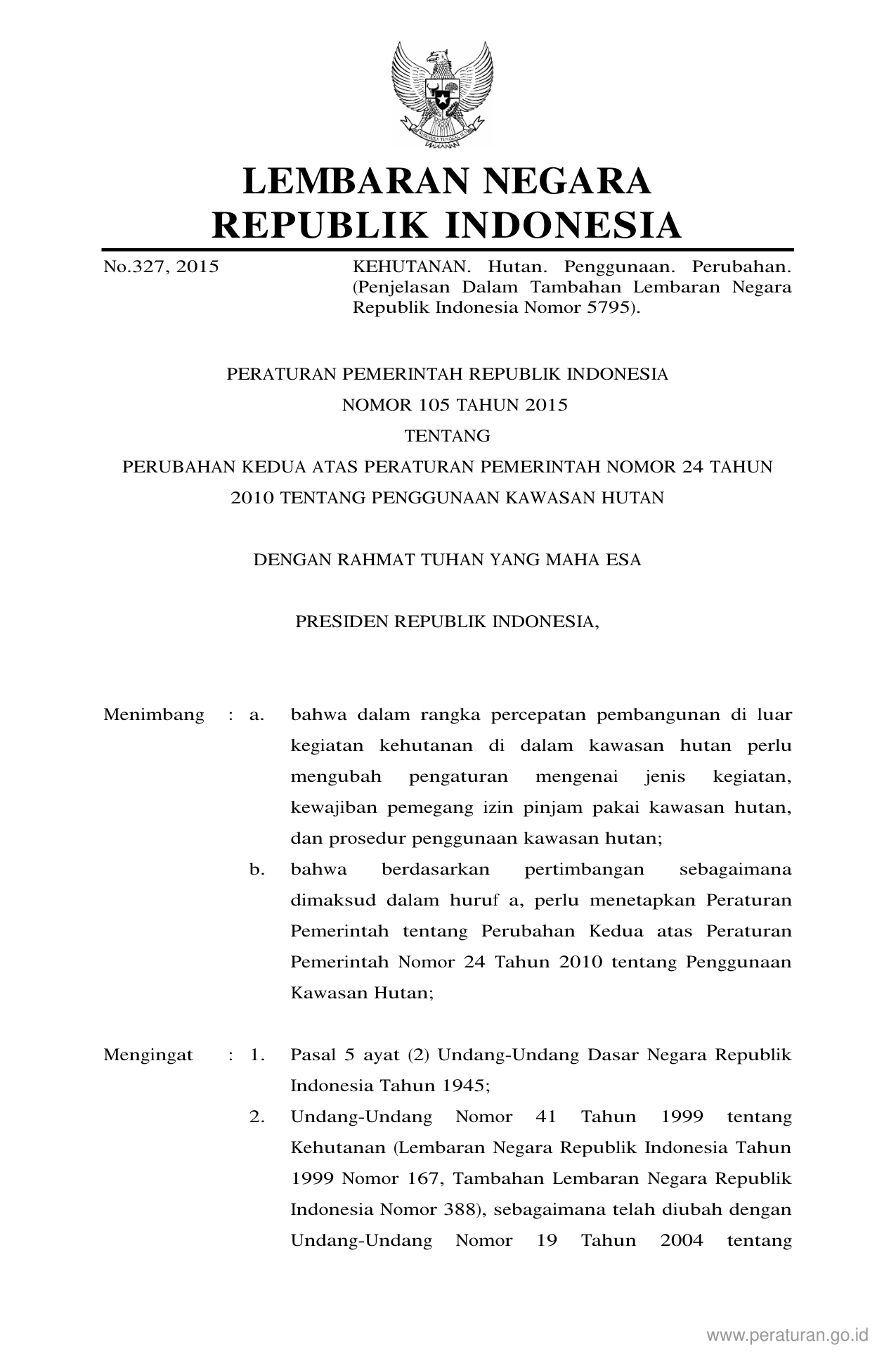 PP Nomor 105 Tahun 2015 | Peraturan Pemerintah Nomor 105 Tahun 2015 tentang PERUBAHAN KEDUA ATAS PERATURAN PEMERINTAH NOMOR 24 TAHUN 2010 TENTANG PENGGUNAAN KAWASAAN HUTAN