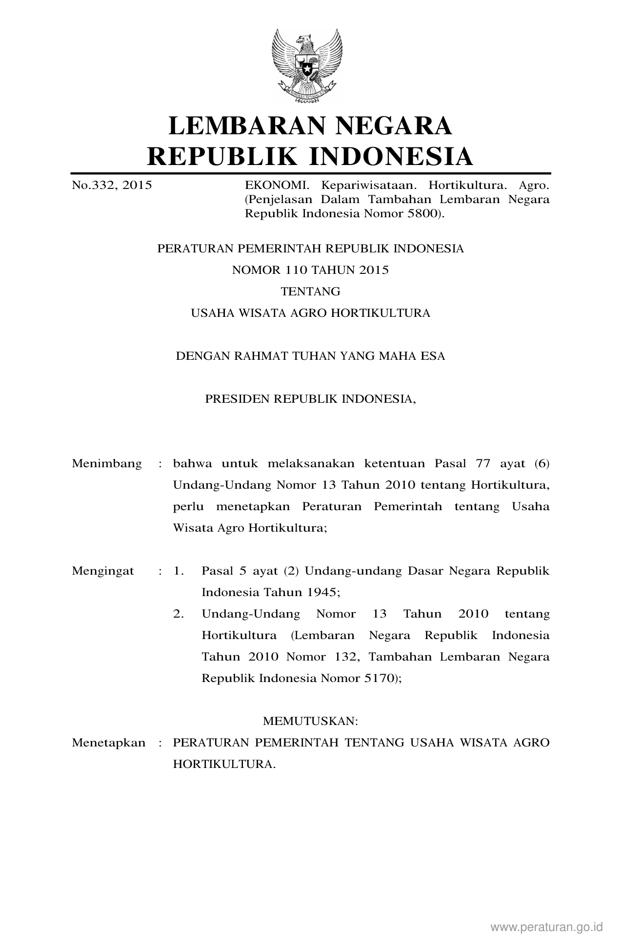 PP Nomor 110 Tahun 2015 | Peraturan Pemerintah Nomor 110 Tahun 2015 tentang USAHA WISATA AGRO HORTIKULTURA