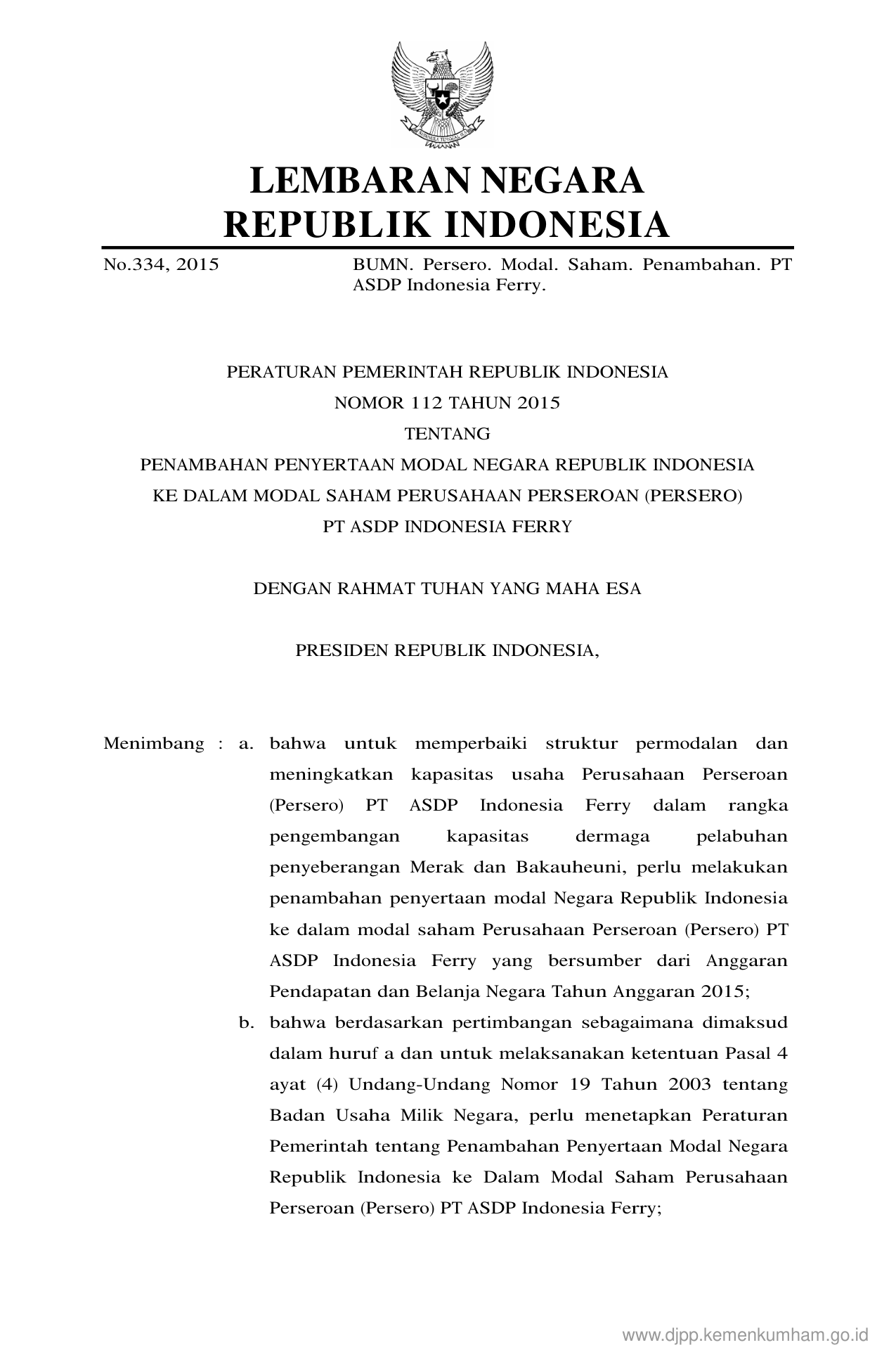 PP Nomor 112 Tahun 2015 | Peraturan Pemerintah Nomor 112 Tahun 2015 tentang PENAMBAHAN PENYERTAAN MODAL NEGARA REPUBLIK INDONESIA KE DALAM MODAL SAHAM PERUSAHAAN PERSEROAN PERSERO PT ASDP INDONESIA FERRY