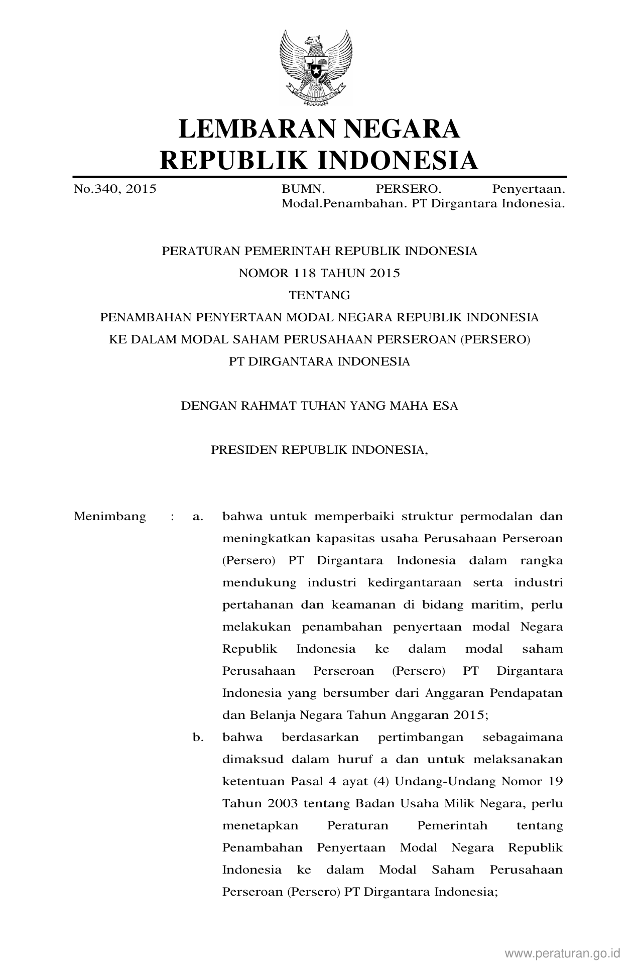 PP Nomor 118 Tahun 2015 | Peraturan Pemerintah Nomor 118 Tahun 2015 tentang PENAMBAHAN PENYERTAAN MODAL NEGARA REPUBLIK INDONESIA KE DALAM MODAL SAHAM PERUSAHAAN PERSEROAN PERSERO PT DIRGANTARA INDONESIA