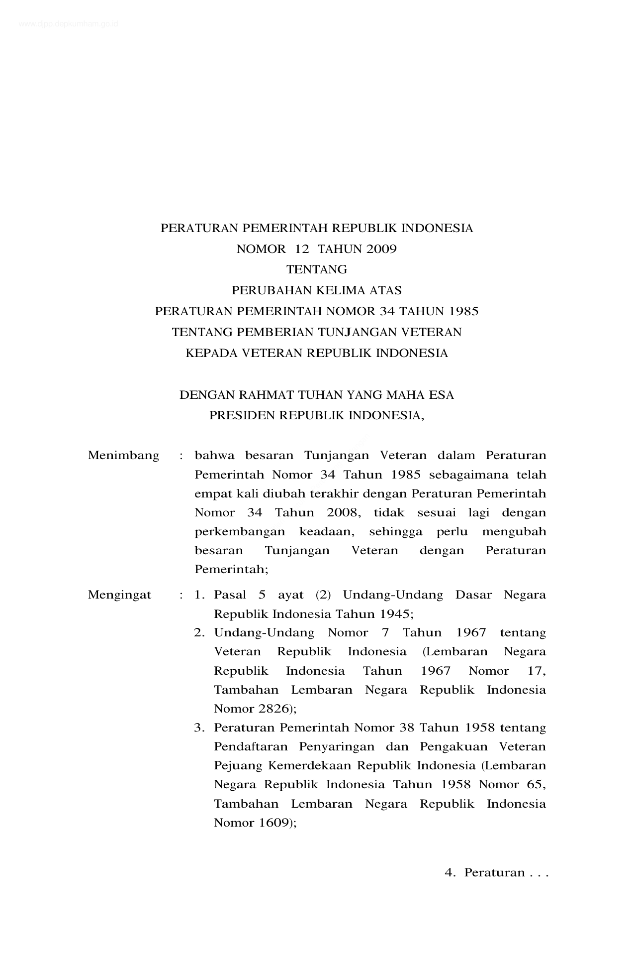 PP Nomor 12 Tahun 2009 | Peraturan Pemerintah Nomor 12 Tahun 2009 tentang PERUBAHAN KELIMA PP 34-1985 TENTANG PEMBERIAN TUNJANGAN VETERAN KEPADA VETERAN REPUBLIK INDONESIA