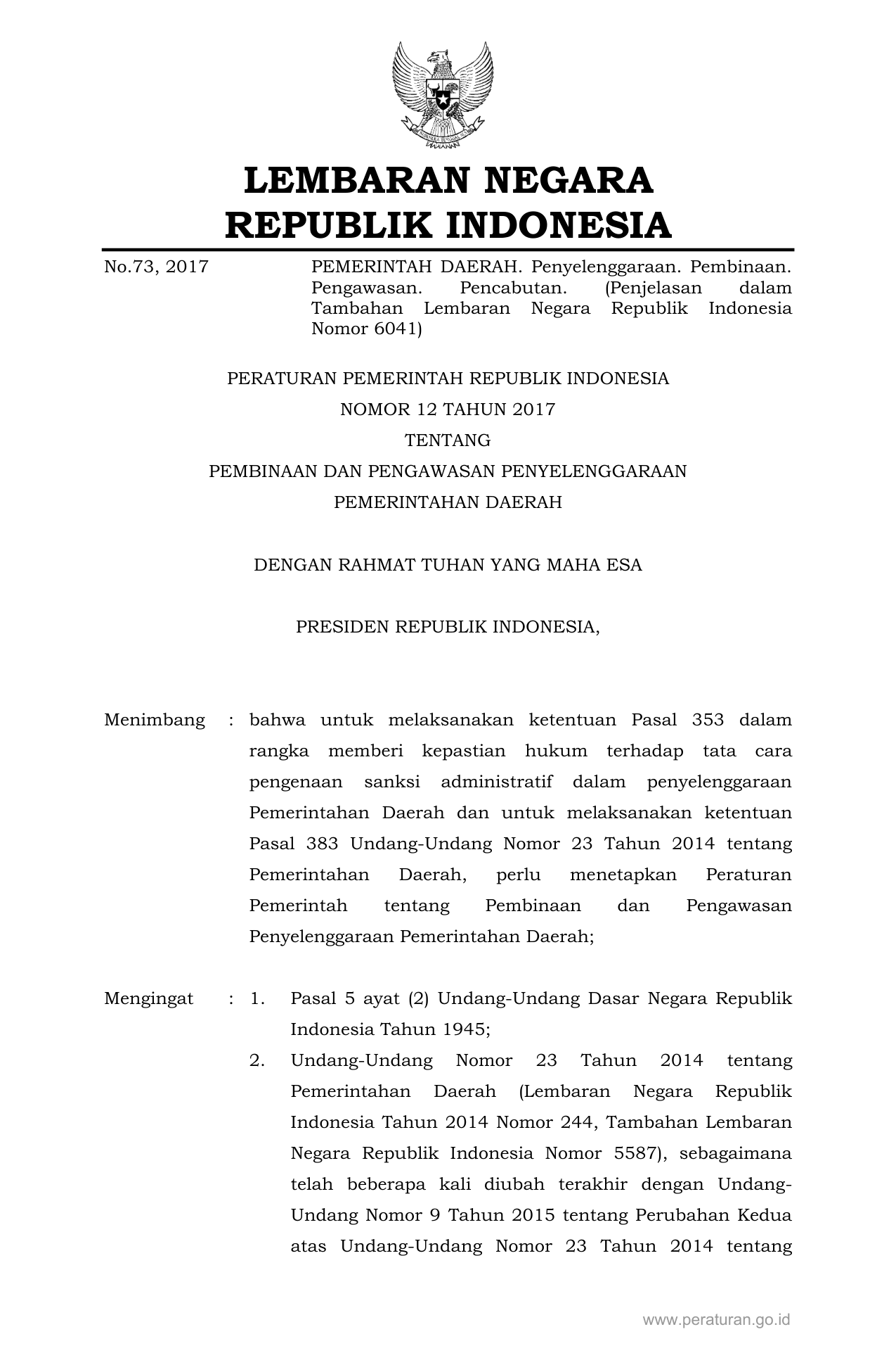 PP Nomor 12 Tahun 2017 | Peraturan Pemerintah Nomor 12 Tahun 2017 tentang Pembinaan dan Pengawasan Penyelenggaraan Pemerintahan Daerah