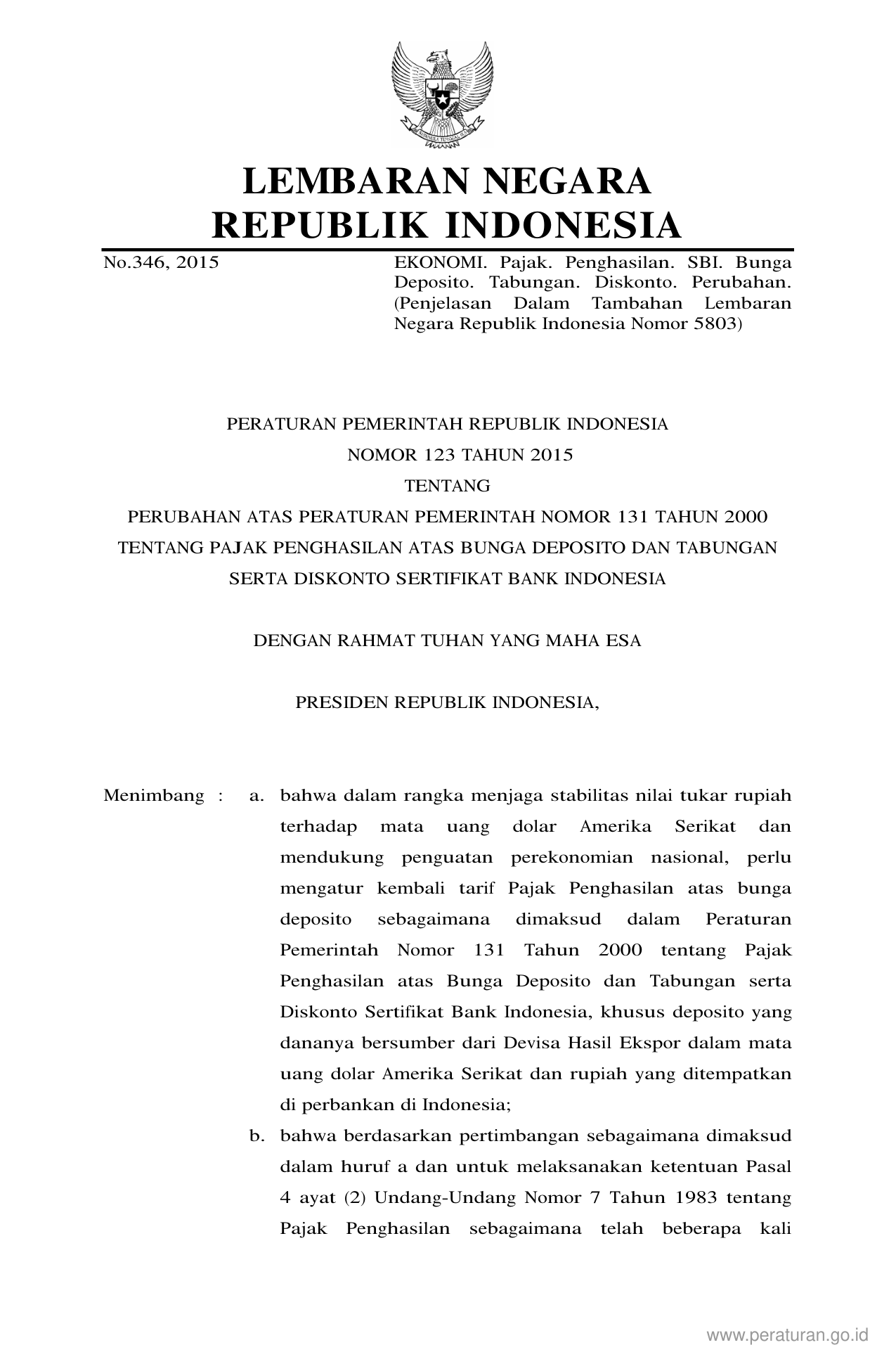PP Nomor 123 Tahun 2015 | Peraturan Pemerintah Nomor 123 Tahun 2015 tentang PERUBAHAN ATAS PERATURAN PEMERINTAH NOMOR 131 TAHUN 2000 TENTANG PAJAK PENGHASILAN ATAS BUNGA DEPOSITO DAN TABUNGAN SERTA DISKONTO SERTIFIKAT BANK INDONESIA