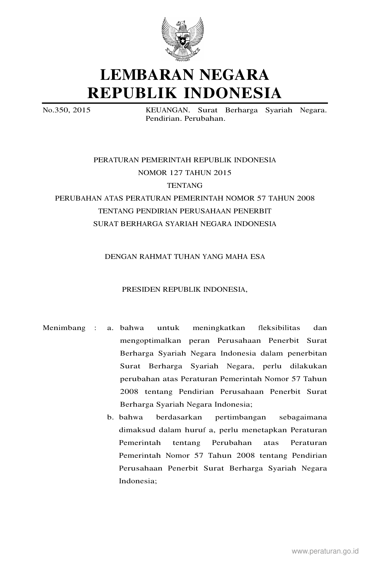 PP Nomor 127 Tahun 2015 | Peraturan Pemerintah Nomor 127 Tahun 2015 tentang PERUBAHAN ATAS PERATURAN PEMERINTAH NOMOR 57 TAHUN 2008 TENTANG PERUSAHAAN PENERBIT SURAT BERHARGA SYARIAH NEAGAR INDONESIA