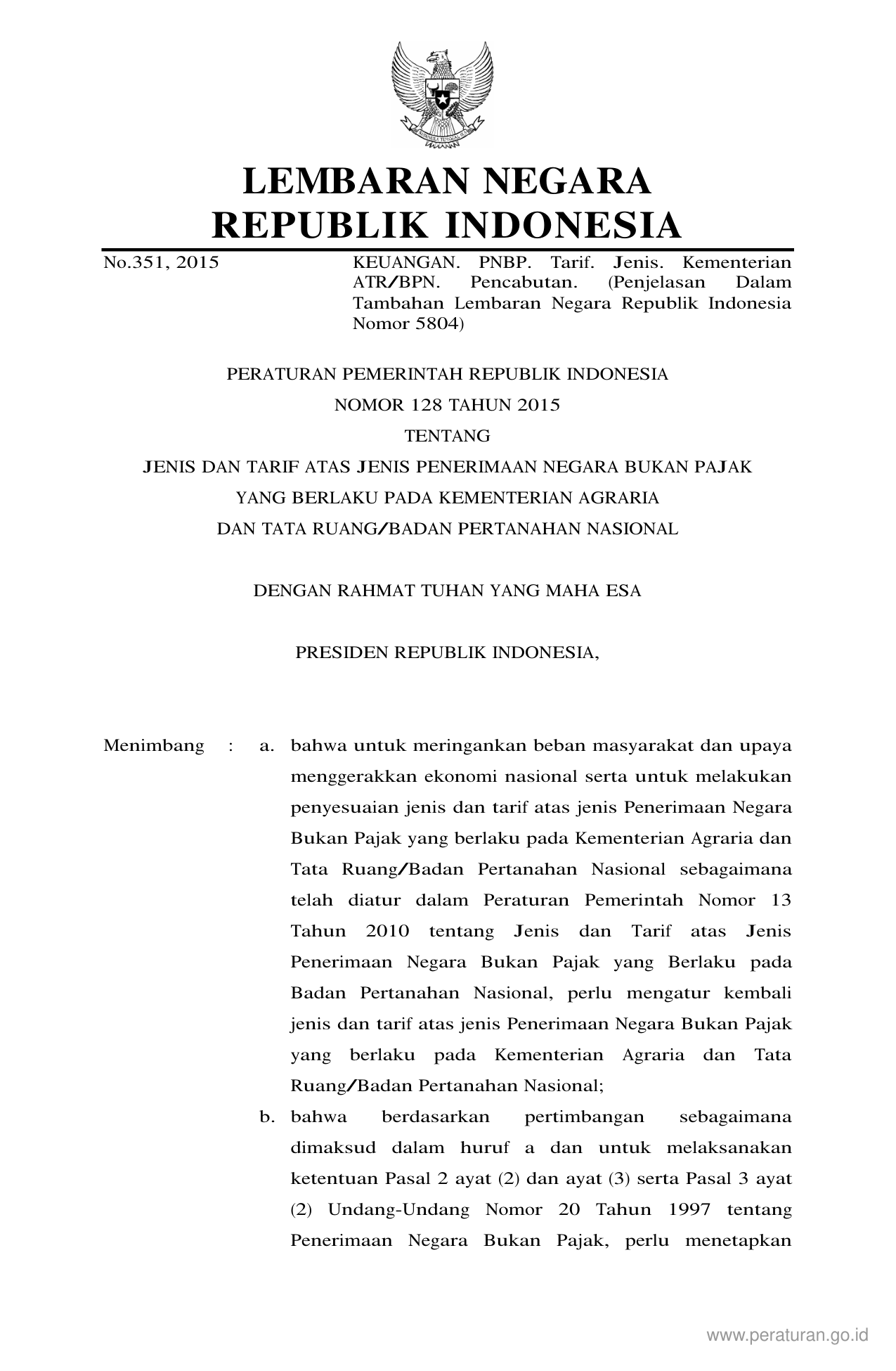PP Nomor 128 Tahun 2015 | Peraturan Pemerintah Nomor 128 Tahun 2015 tentang JENIS DAN TARIF ATAS JENIS PENERIMAAN NEGARA BUKAN PAJAK YANG BERLAKU PADA KEMENTERIAN AGRARIA DAN TATA RUANGBADAN PERTANAHAN NASIONAL