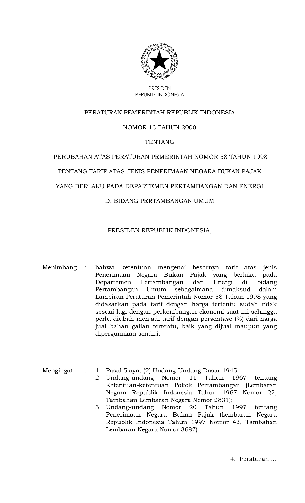 PP Nomor 13 Tahun 2000 | Peraturan Pemerintah Nomor 13 Tahun 2000 tentang PERUBAHAN PP 58-1998 TENTANG TARIF ATAS JENIS PENERIMAAN NEGARA BUKAN PAJAK YANG BERLAKU PADA DEPARTEMEN PERTAMBAHAN DAN ENERGI DI BIDANG PERTAMBANGAN UMUM
