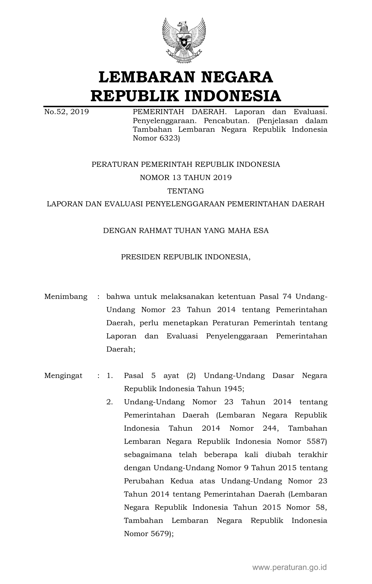 PP Nomor 13 Tahun 2019 | Peraturan Pemerintah Nomor 13 Tahun 2019 tentang LAPORAN DAN EVALUASI PENYELENGGARAAN PEMERINTAHAN DAERAH