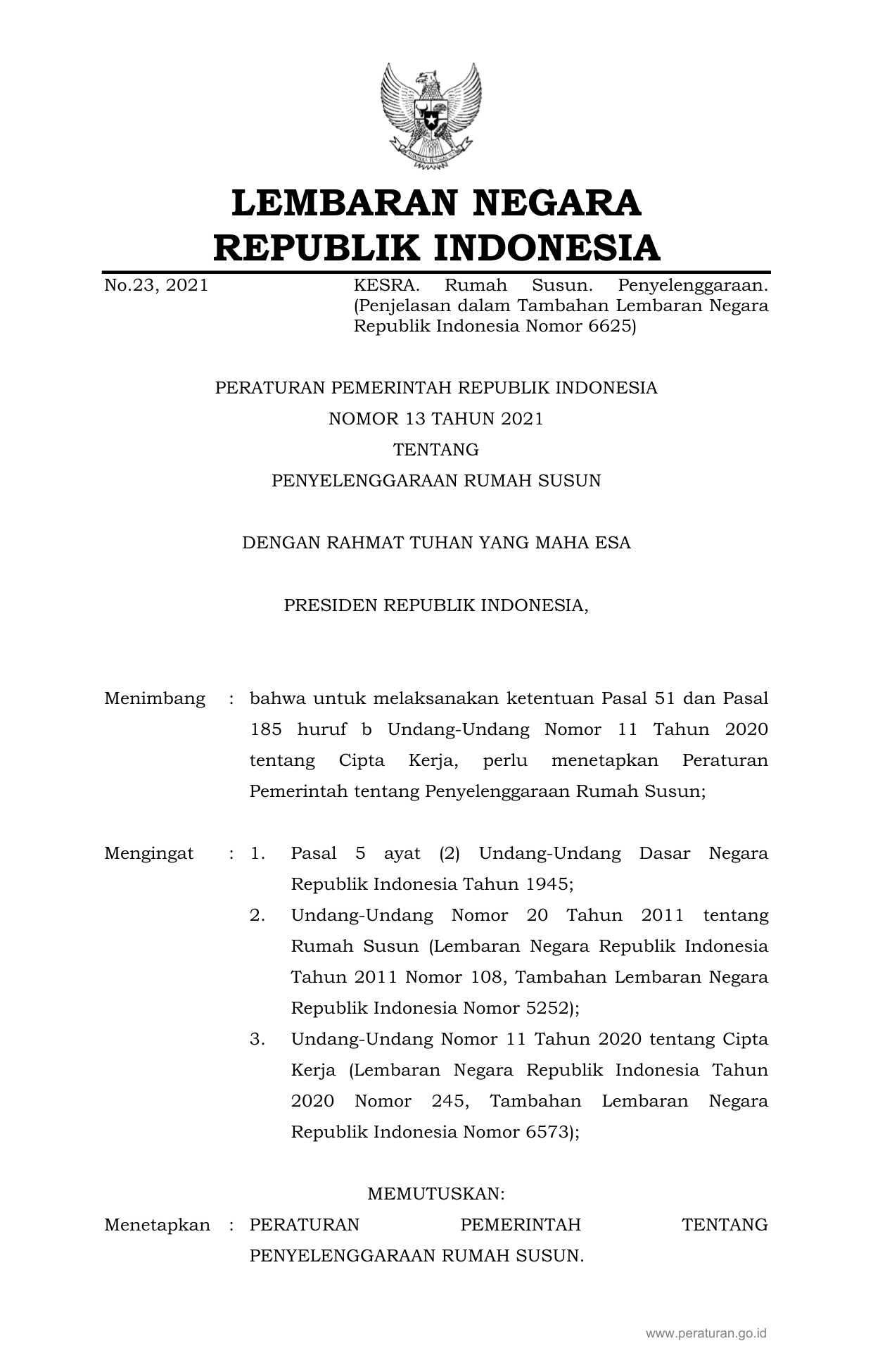 PP Nomor 13 Tahun 2021 | Peraturan Pemerintah Nomor 13 Tahun 2021 tentang PENYELENGGARAAN RUMAH SUSUN