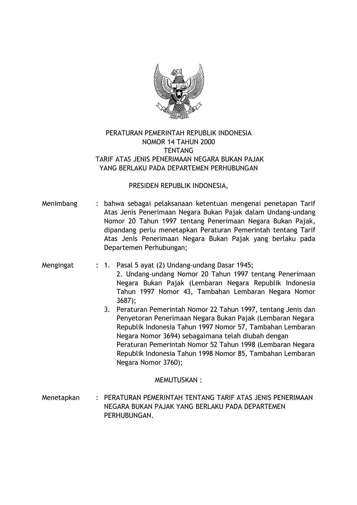PP Nomor 14 Tahun 2000 | Peraturan Pemerintah Nomor 14 Tahun 2000 tentang TARIF DAN JENIS PENERIMAAN NEGARA BUKAN PAJAK ANG BERLAKU PADA DEPARTEMEN PERHUBUNGAN