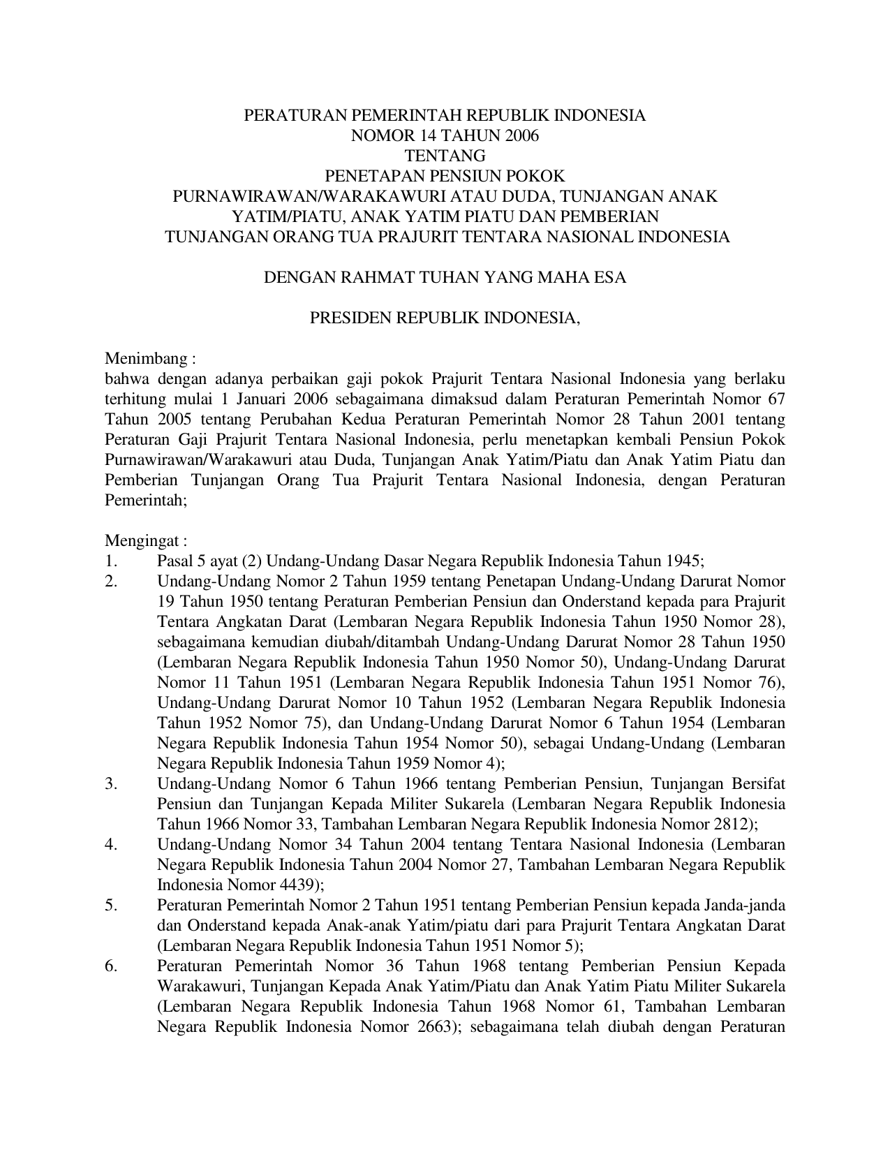 PP Nomor 14 Tahun 2006 | Peraturan Pemerintah Nomor 14 Tahun 2006 tentang PENETAPAN PENSIUN POKOK PURNAWIRAWAN/WARAKAWURI ATAU DUDA, TUNJANGAN ANAK YATIM/PIATU, ANAK YATIM PIATU DAN PEMBERIAN TUNJANGAN ORANG TUA PRAJURIT TENTARA NASIONAL INDONESIA