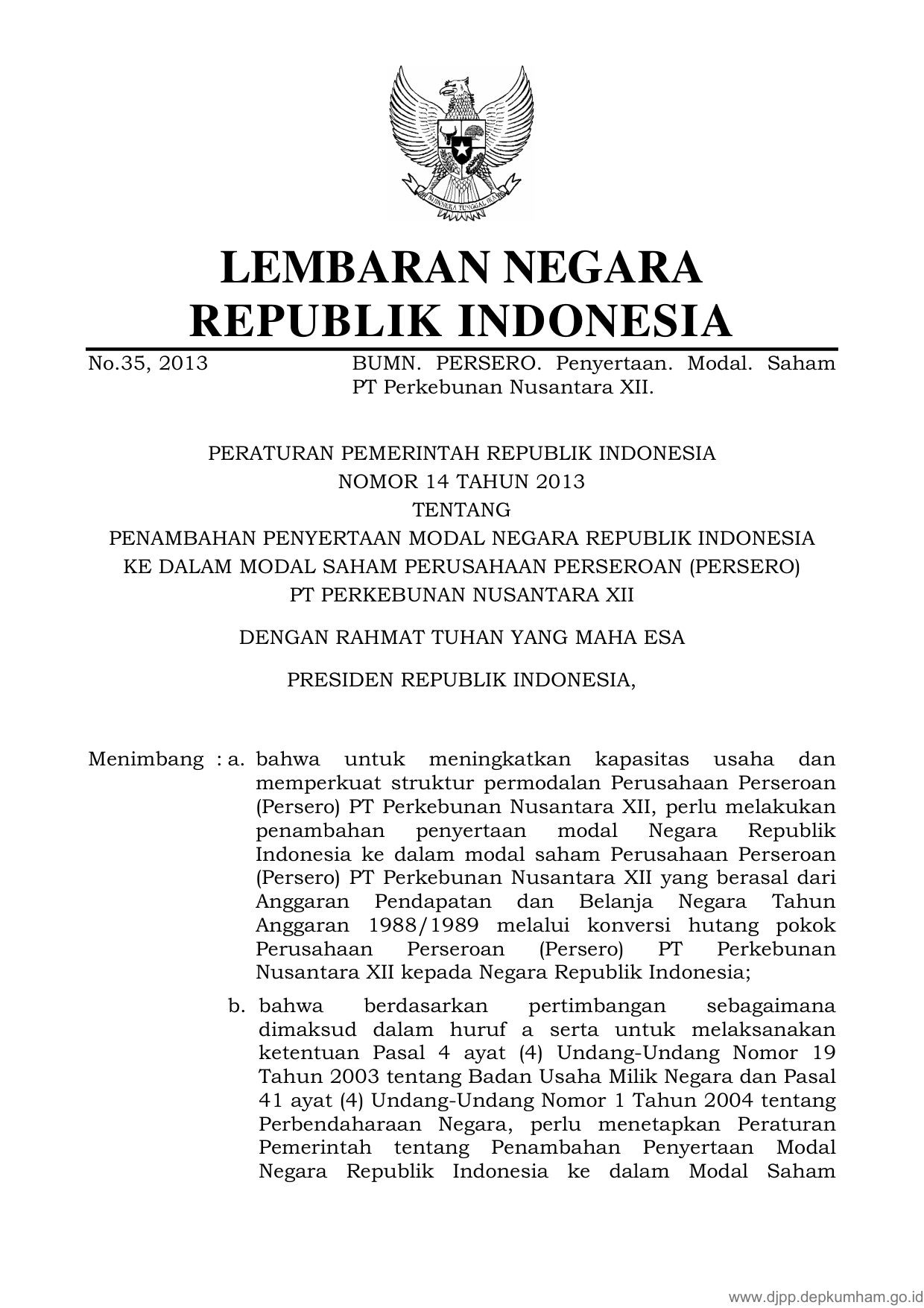 PP Nomor 14 Tahun 2013 | Peraturan Pemerintah Nomor 14 Tahun 2013 tentang PENAMBAHAN PENYERTAAN MODAL NEGARA REPUBLIK INDONESIA KE DALAM MODAL SAHAM PERUSAHAAN PERSEROAN (PERSERO) PT PERKEBUNAN NUSANTARA XII