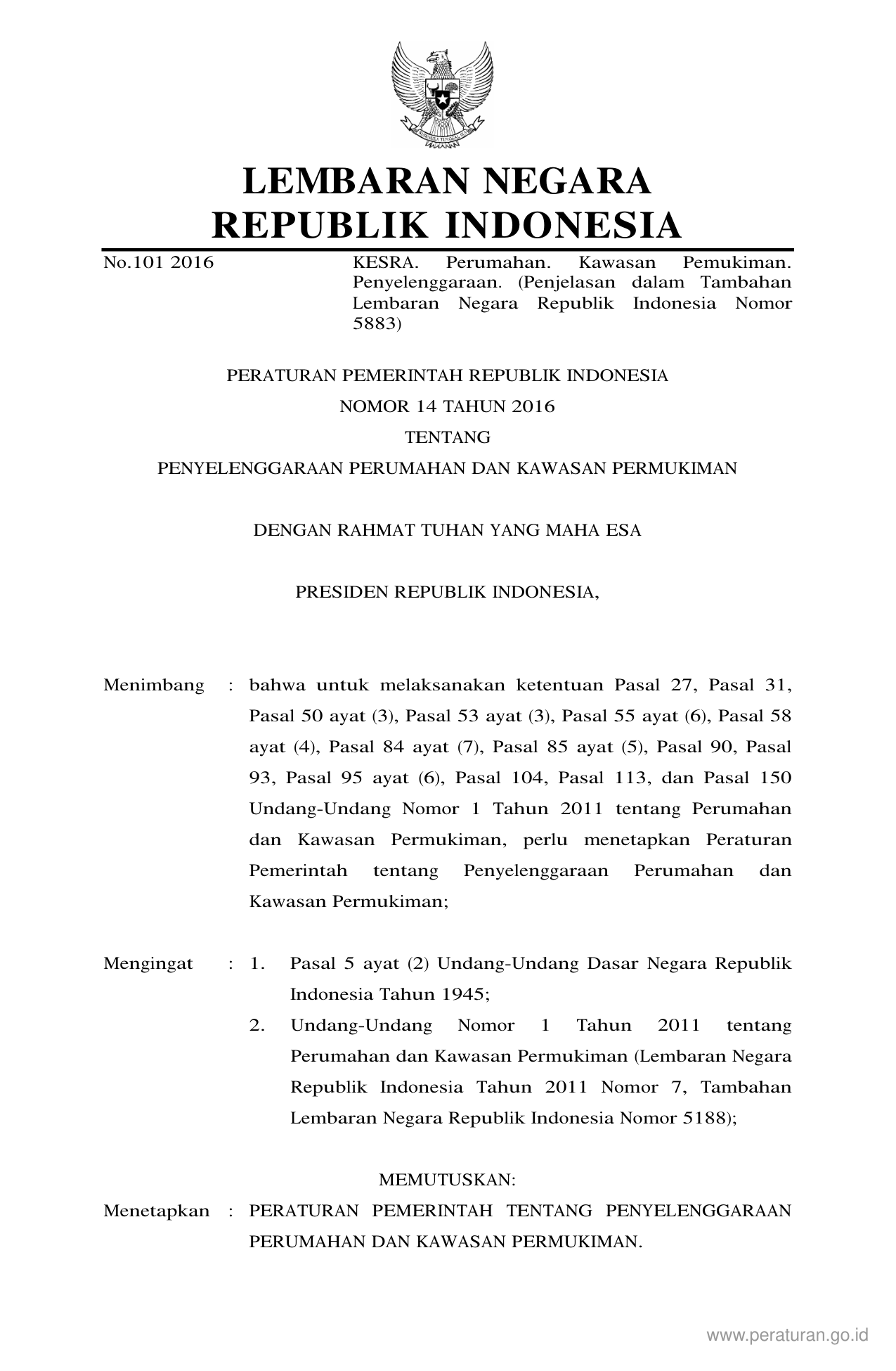 PP Nomor 14 Tahun 2016 | Peraturan Pemerintah Nomor 14 Tahun 2016 tentang PENYELENGGARAAN PERUMAHAN DAN KAWASAN PERMUKIMAN