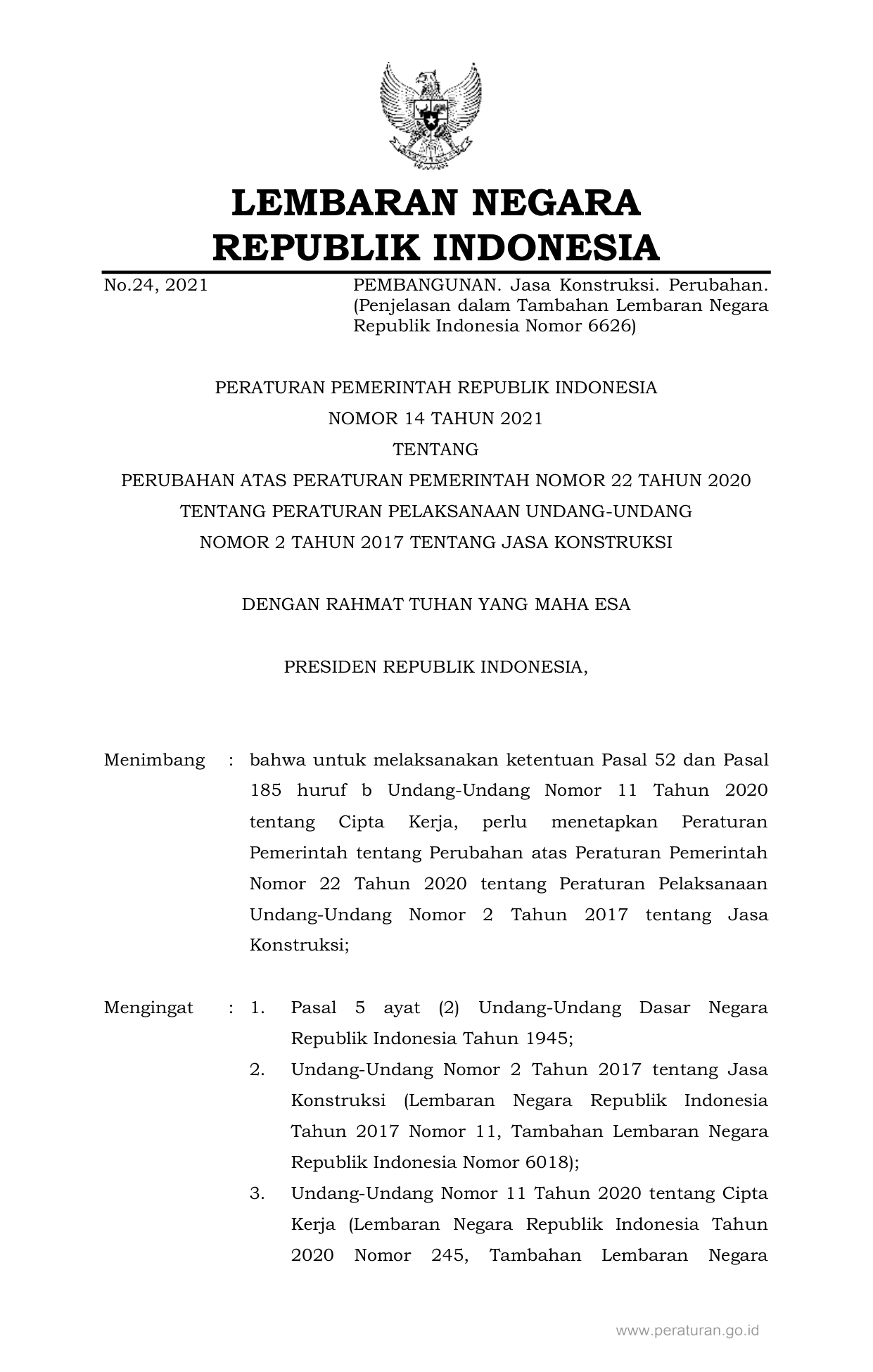 PP Nomor 14 Tahun 2021 | Peraturan Pemerintah Nomor 14 Tahun 2021 tentang PERUBAHAN ATAS PERATURAN PEMERINTAH NOMOR 22 TAHUN 2020 TENTANG PERATURAN PELAKSANAAN UNDANG-UNDANG NOMOR 2 TAHUN 2017 TENTANG JASA KONSTRUKSI