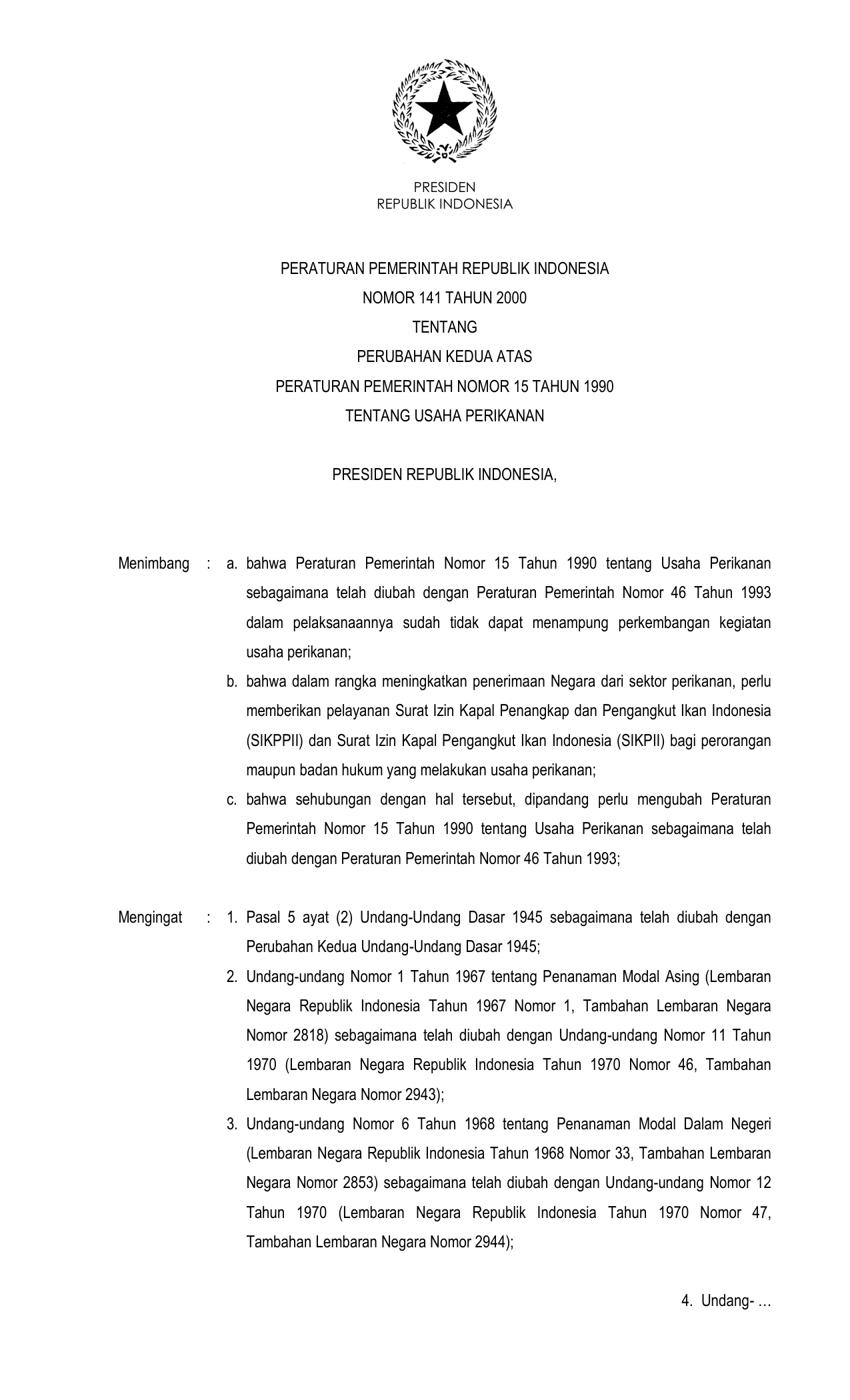 PP Nomor 141 Tahun 2000 | Peraturan Pemerintah Nomor 141 Tahun 2000 tentang PERUBAHAN KEDUA PP 15-1990 TENTANG USAHA PERIKANAN