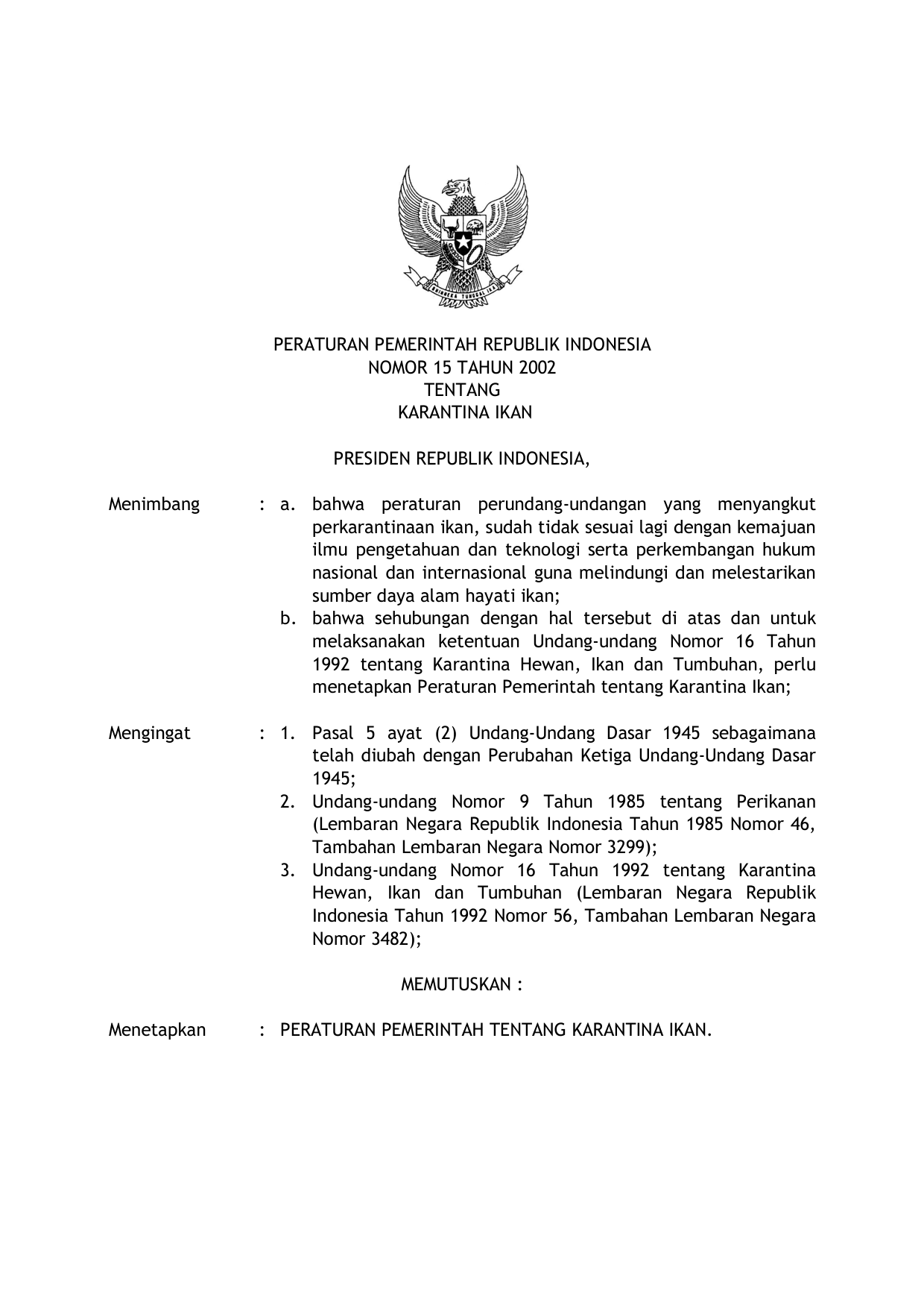 PP Nomor 15 Tahun 2002 | Peraturan Pemerintah Nomor 15 Tahun 2002 tentang KARANTINA IKAN