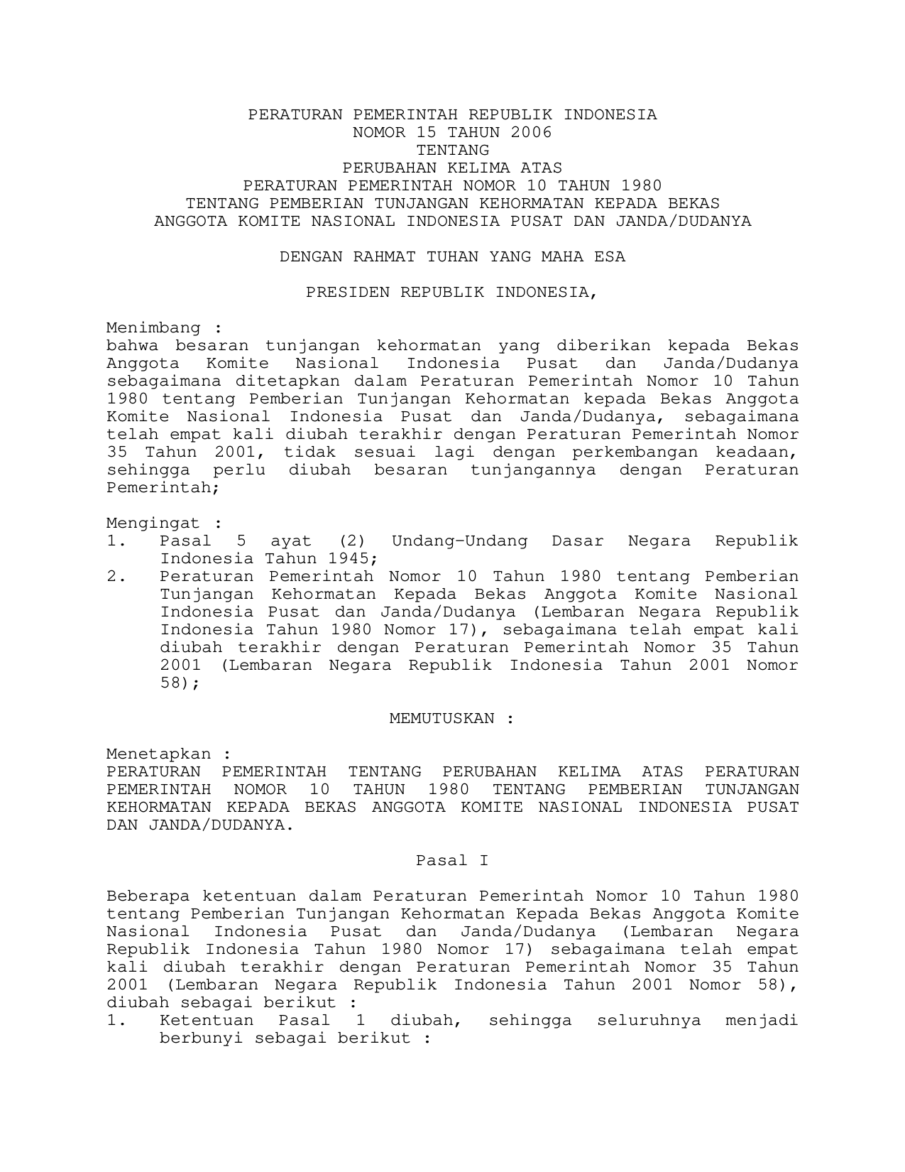 PP Nomor 15 Tahun 2006 | Peraturan Pemerintah Nomor 15 Tahun 2006 tentang PERUBAHAN KELIMA PP 10-1980 TENTANG PEMBERIAN TUNJANGAN KEHORMATAN KEPADA BEKAS ANGGOTA KOMITE NASIONAL INDONESIA PUSAT DAN JANDA/DUDANYA