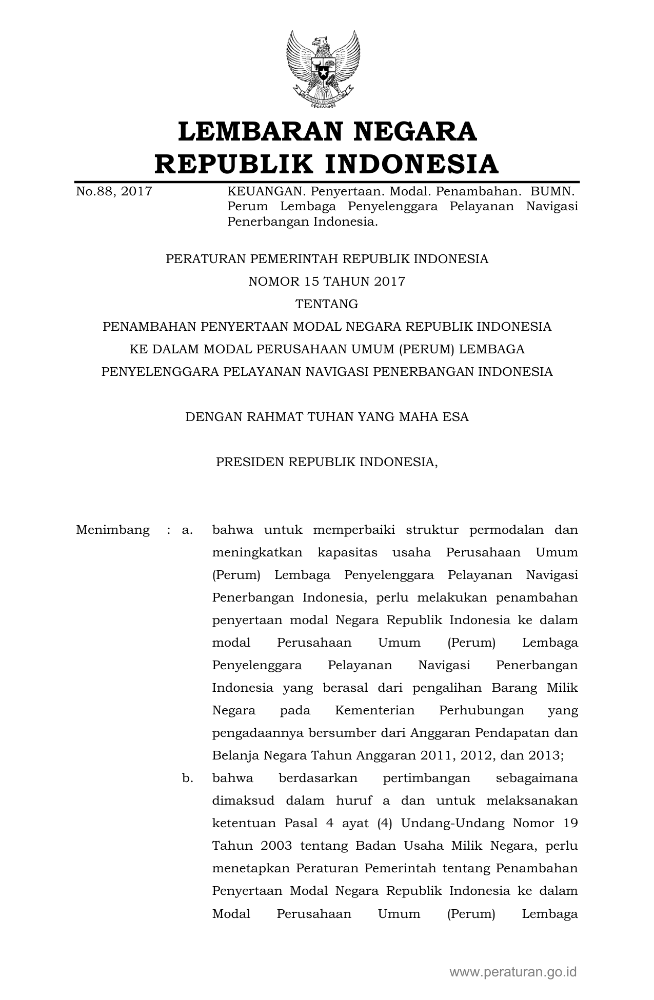 PP Nomor 15 Tahun 2017 | Peraturan Pemerintah Nomor 15 Tahun 2017 tentang Penambahan Penyertaan Modal Negara Republik Indonesia ke Dalam Modal Perusahaan Umum (Perum) Lembaga Penyelenggara Pelayanan Navigasi Penerbangan Indonesia