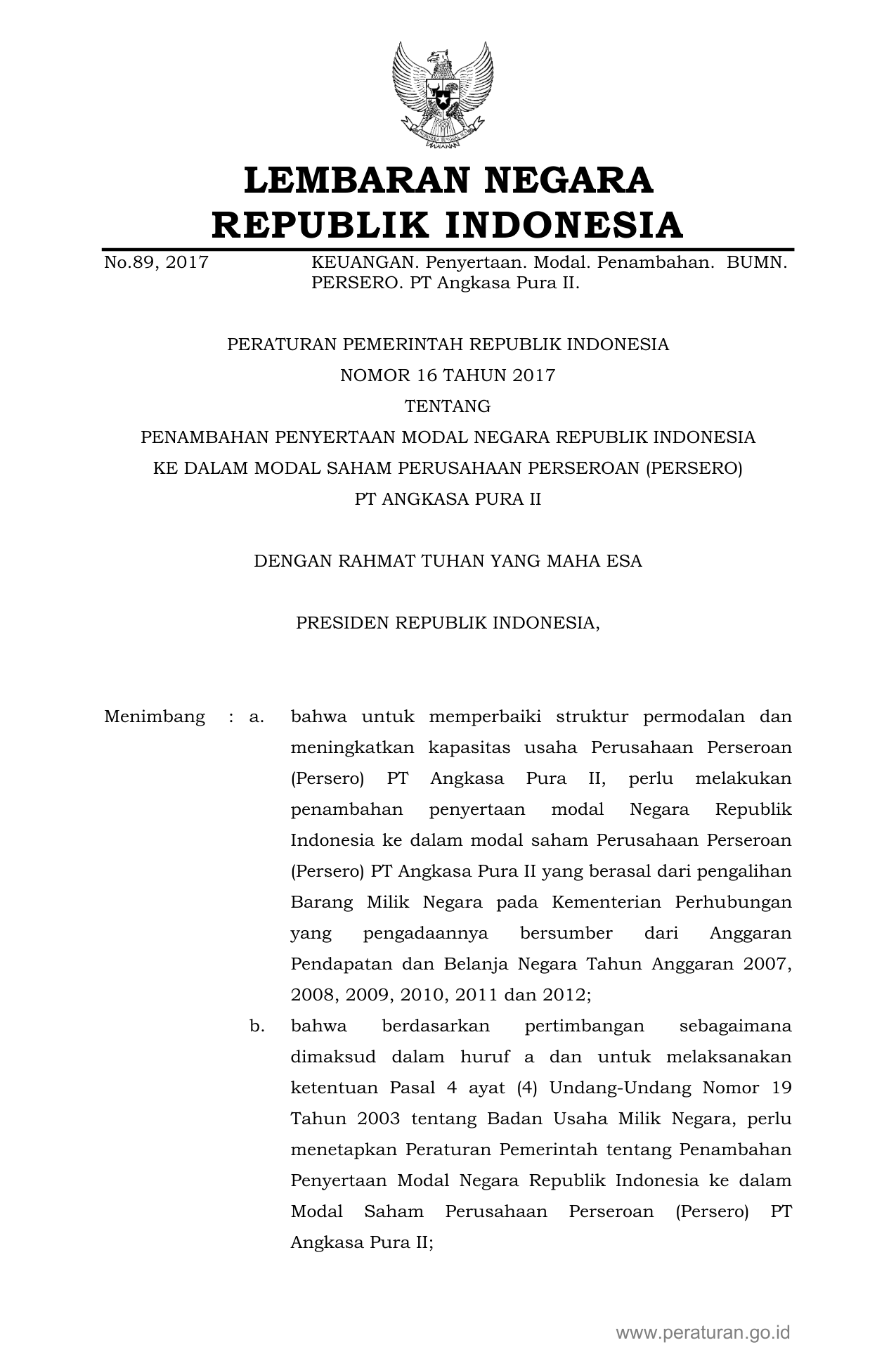 PP Nomor 16 Tahun 2017 | Peraturan Pemerintah Nomor 16 Tahun 2017 tentang Penambahan Penyertaan Modal Negara Republik Indonesia ke Dalam Modal Saham Perusahaan Perseroan (Persero) PT Angkasa Pura II