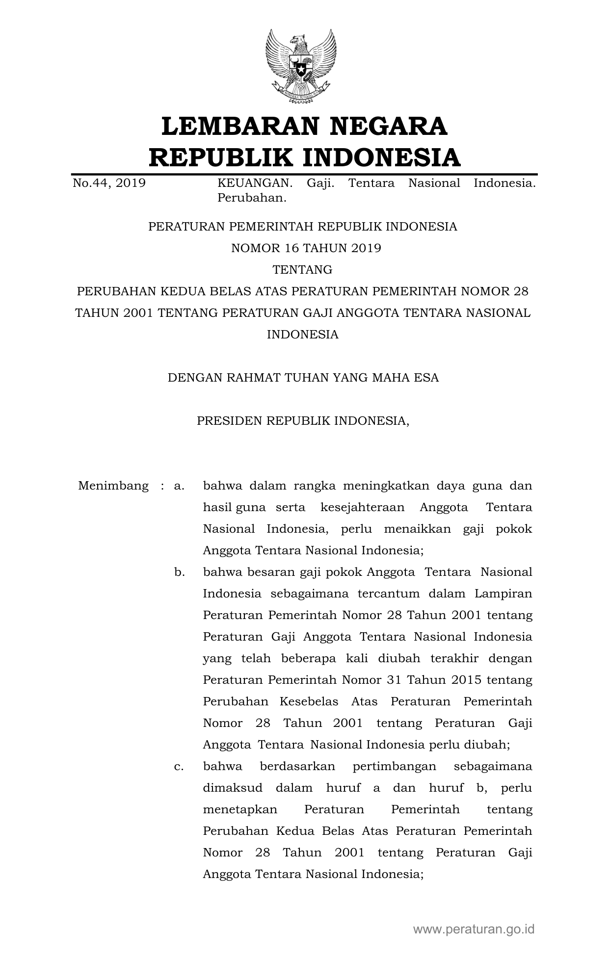 PP Nomor 16 Tahun 2019 | Peraturan Pemerintah Nomor 16 Tahun 2019 tentang PERUBAHAN KEDUA BELAS ATAS PERATURAN PEMERINTAH NOMOR 28 TAHUN 2001 TENTANG PERATURAN GAJI ANGGOTA TENTARA NASIONAL INDONESIA