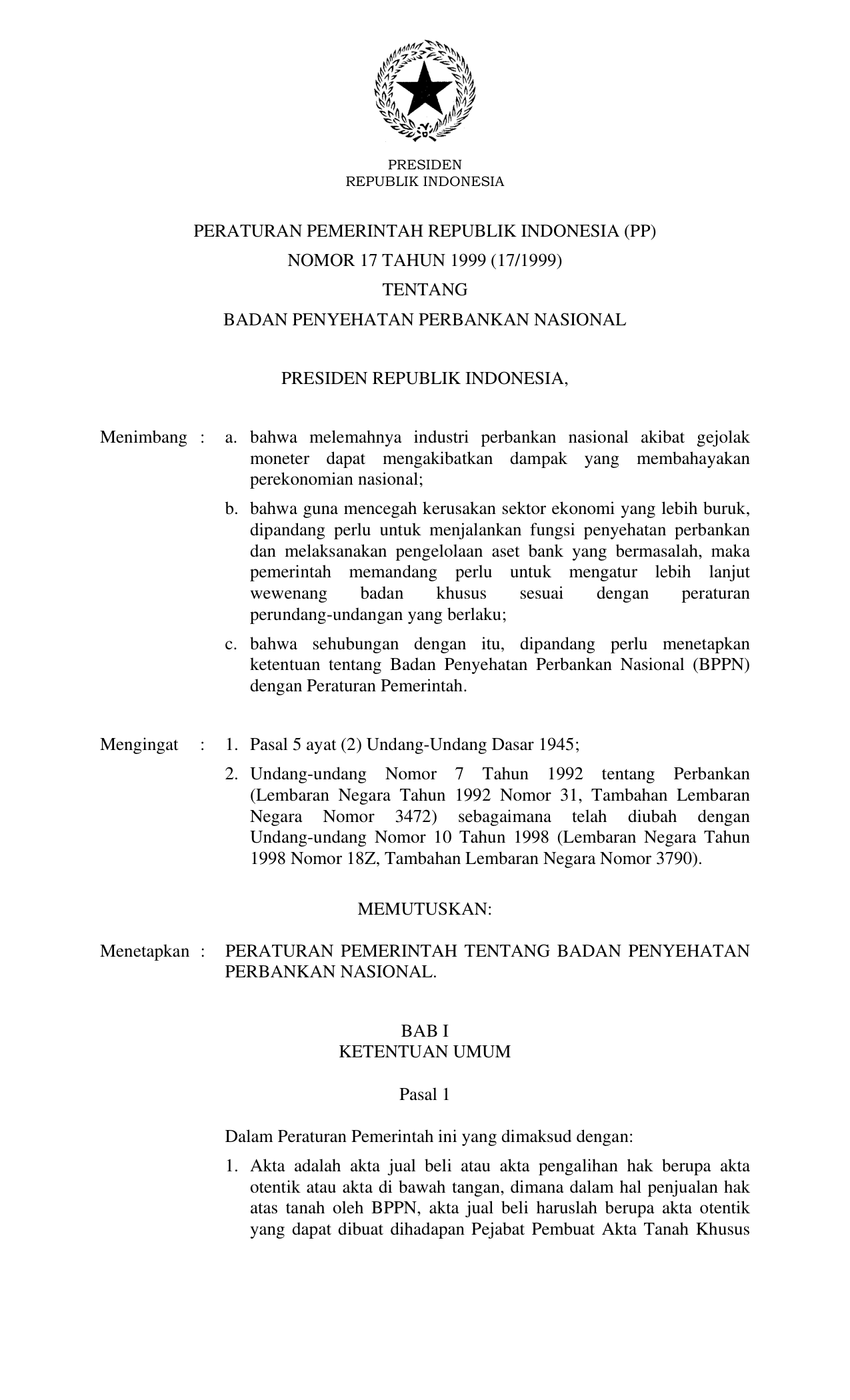 PP Nomor 17 Tahun 1999 | Peraturan Pemerintah Nomor 17 Tahun 1999 tentang BADAN PENYEHATAN PERBANKAN NASIONAL