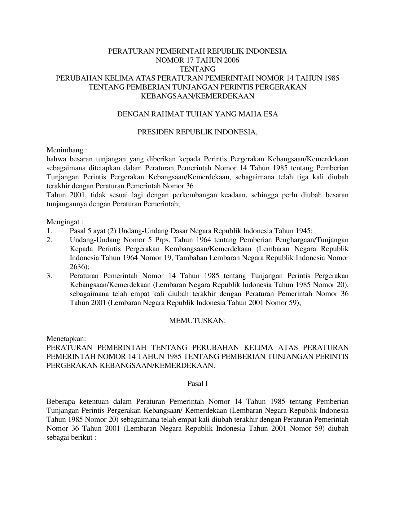 PP Nomor 17 Tahun 2006 | Peraturan Pemerintah Nomor 17 Tahun 2006 tentang PERUBAHAN KELIMA PP 14-1985 TENTANG PEMBERIAN TUNJANGAN PERINTIS PERGERAKAN KEBANGSAAN/KEMERDEKAAN