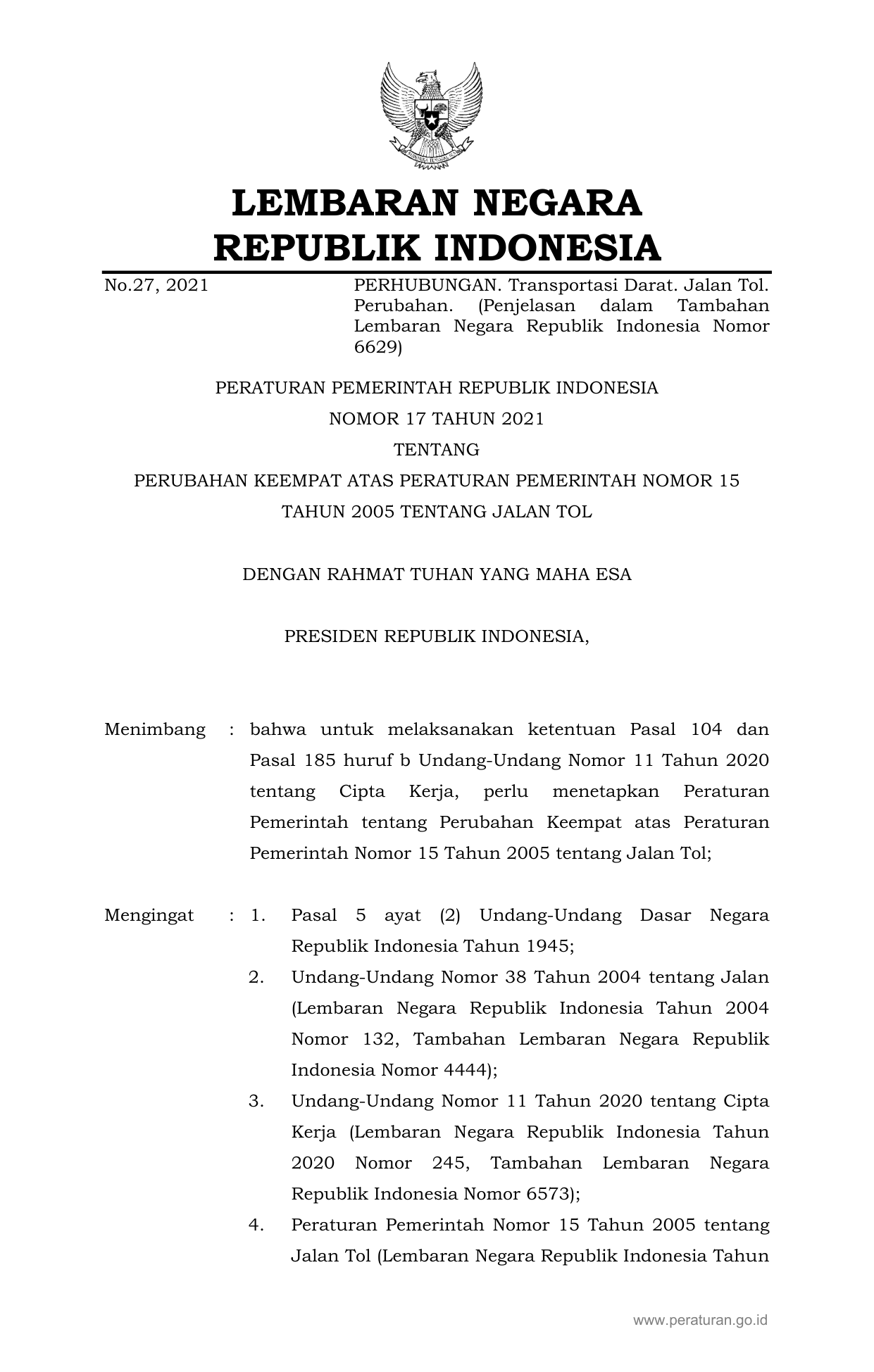 PP Nomor 17 Tahun 2021 | Peraturan Pemerintah Nomor 17 Tahun 2021 tentang PERUBAHAN KEEMPAT ATAS PERATURAN PEMERINTAH NOMOR 15 TAHUN 2005 TENTANG JALAN TOL