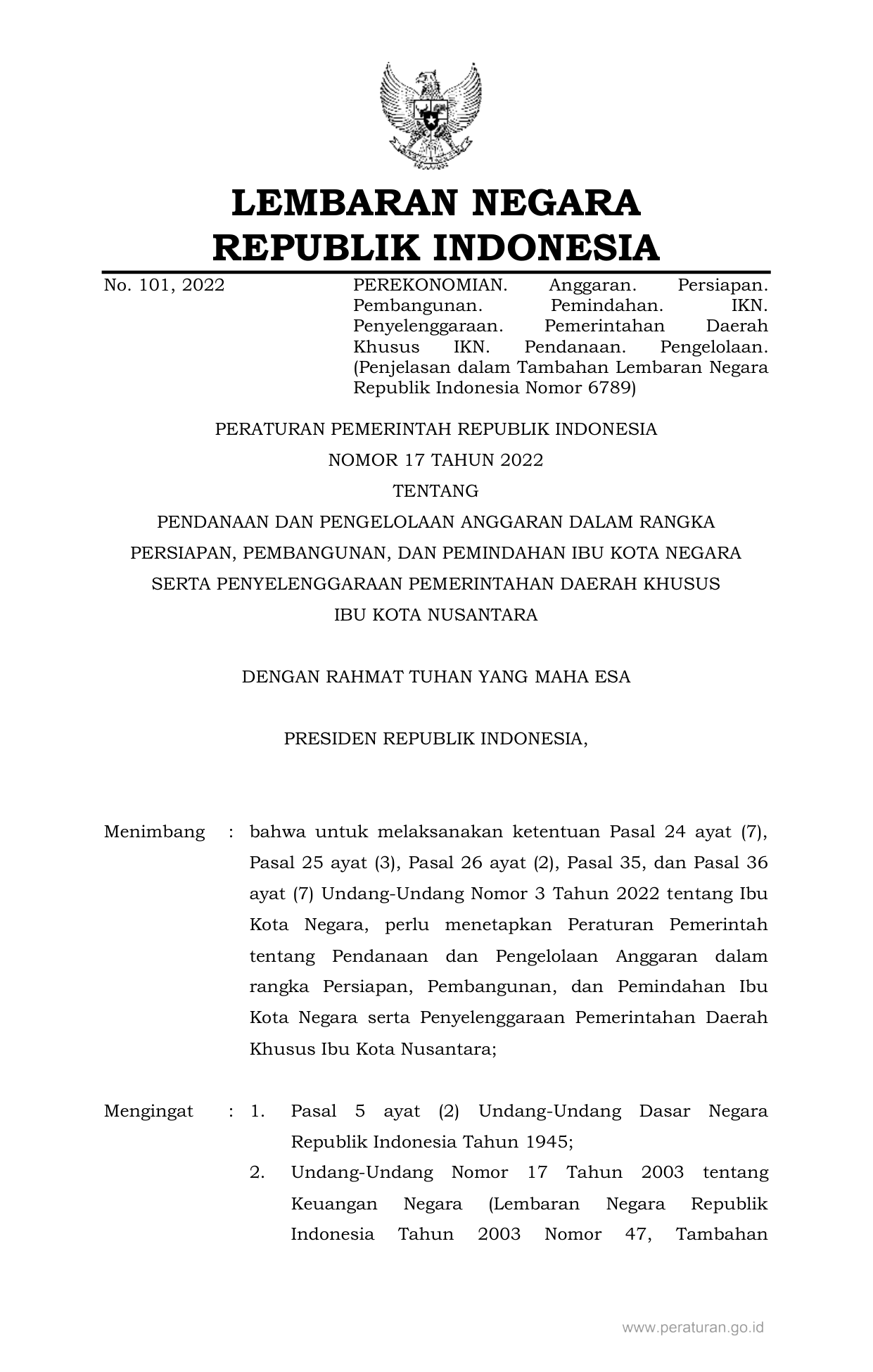 PP Nomor 17 Tahun 2022 | Peraturan Pemerintah Nomor 17 Tahun 2022 tentang PENDANAAN DAN PENGELOLAAN ANGGARAN DALAM RANGKA PERSIAPAN, PEMBANGUNAN, DAN PEMINDAHAN IBU KOTA NEGARA SERTA PENYELENGGARAAN PEMERINTAHAN DAERAH KHUSUS IBU KOTA NUSANTARA