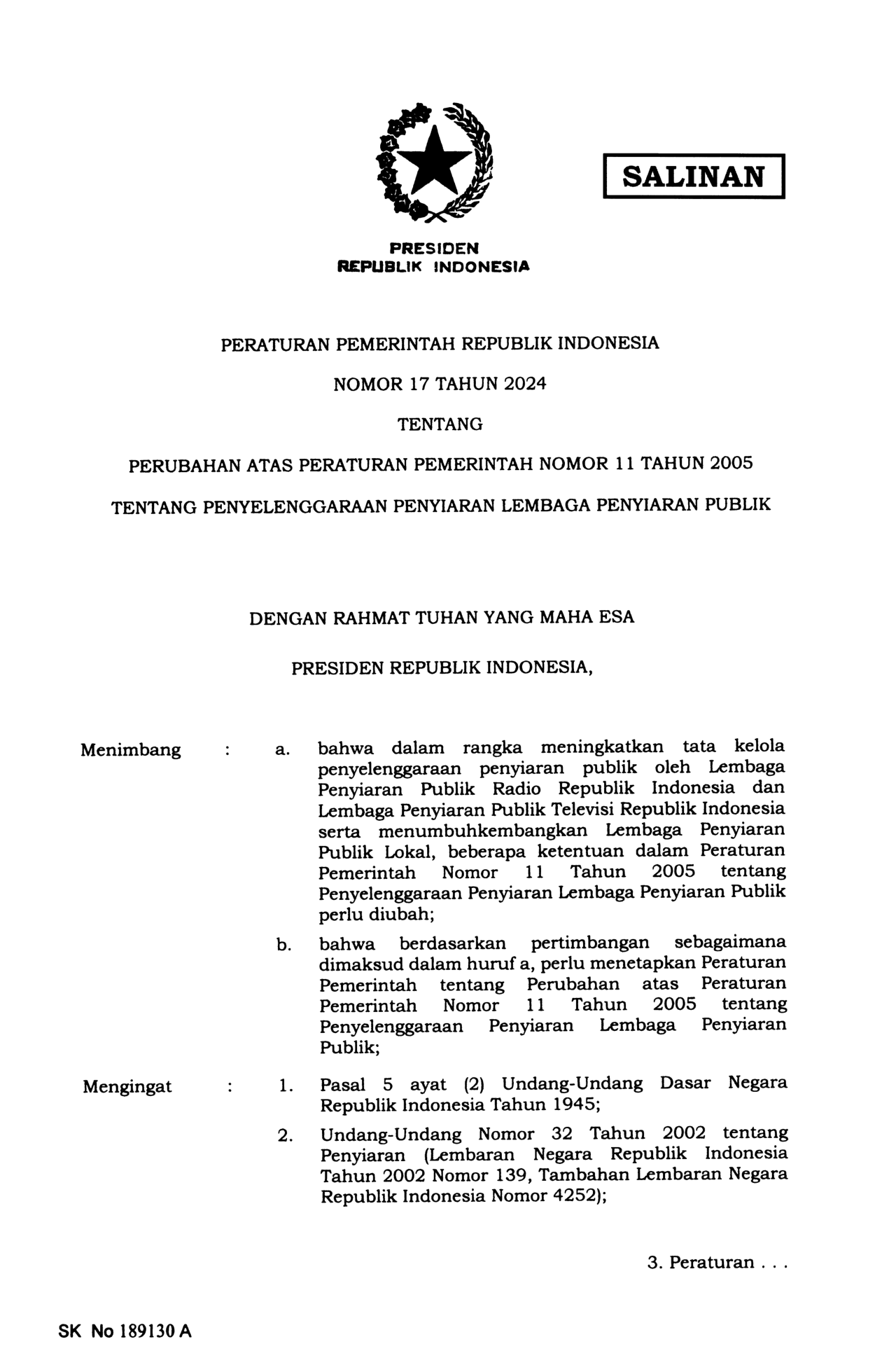 PP Nomor 17 Tahun 2024 | Peraturan Pemerintah Nomor 17 Tahun 2024 tentang PERUBAHAN ATAS PERATURAN PEMERINTAH NOMOR 11 TAHUN 2005 TENTANG PENYELENGGARAAN PENYIARAN LEMBAGA PENYIARAN PUBLIK
