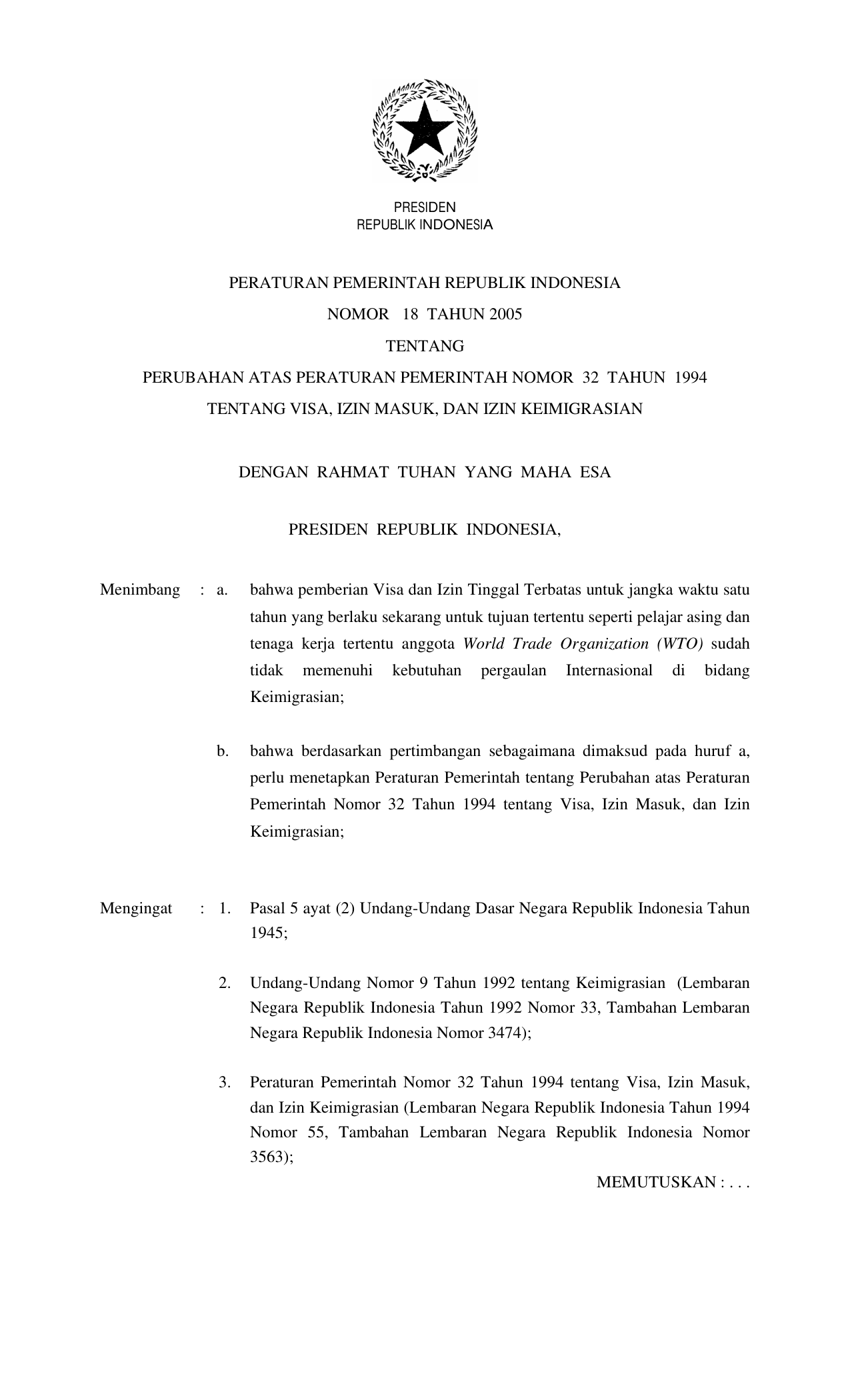 PP Nomor 18 Tahun 2005 | Peraturan Pemerintah Nomor 18 Tahun 2005 tentang PERUBAHAN PP 32-1994 TENTANG VISA, IZIN MASUK, DAN IZIN KEIMIGRASIAN