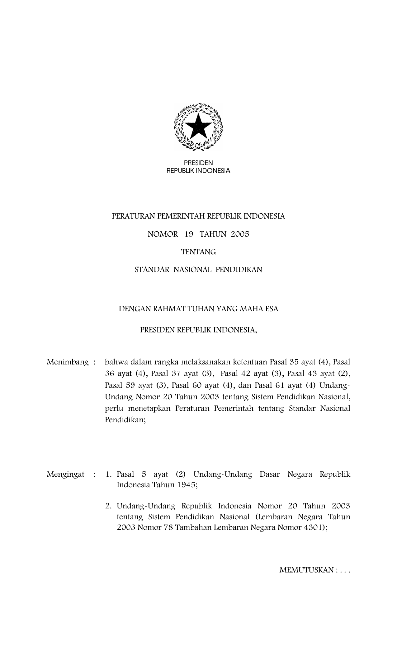 PP Nomor 19 Tahun 2005 | Peraturan Pemerintah Nomor 19 Tahun 2005 tentang STANDAR NASIONAL PENDIDIKAN